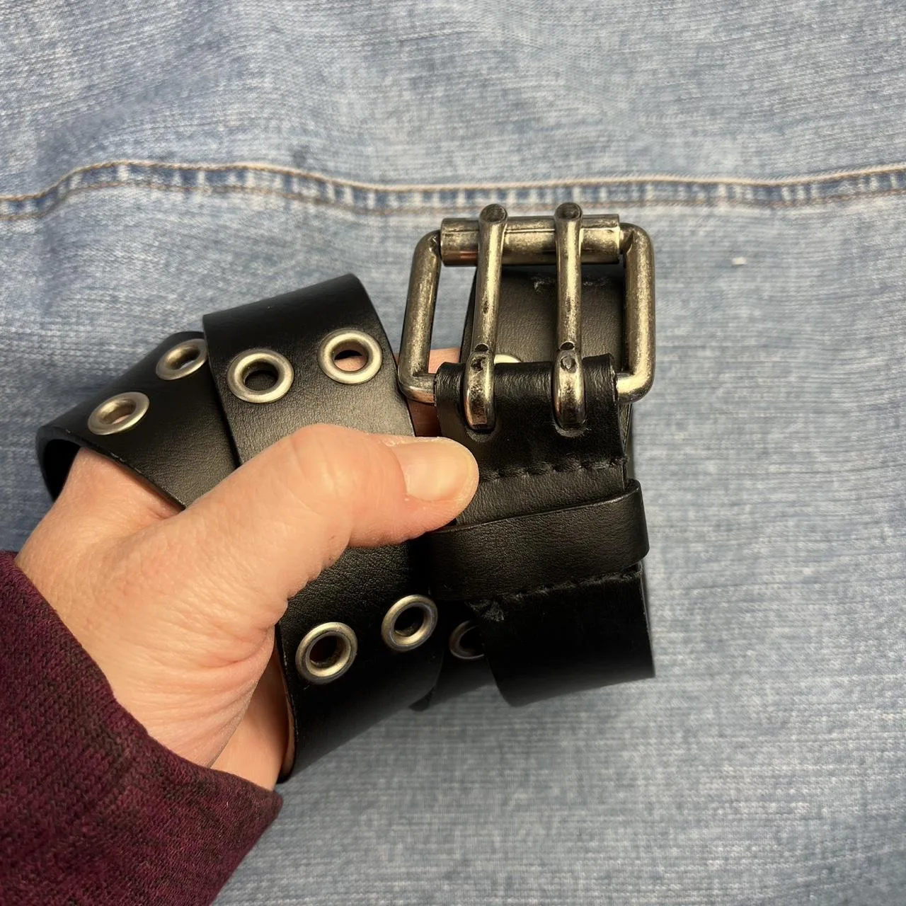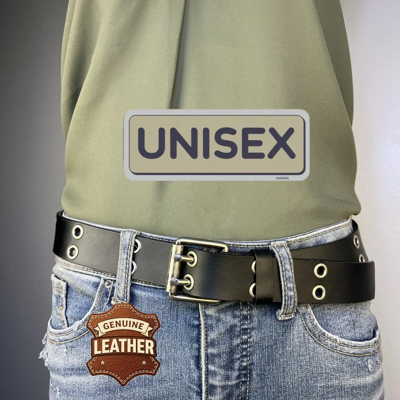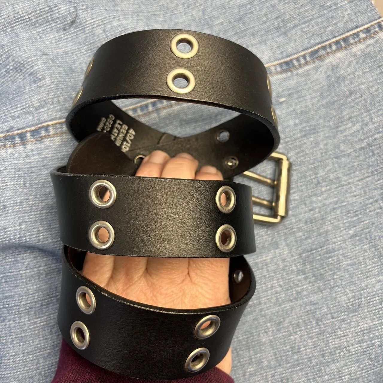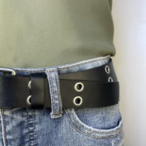 Leather eyelet belt with double prong buckle. Appropriate for a male or female.
