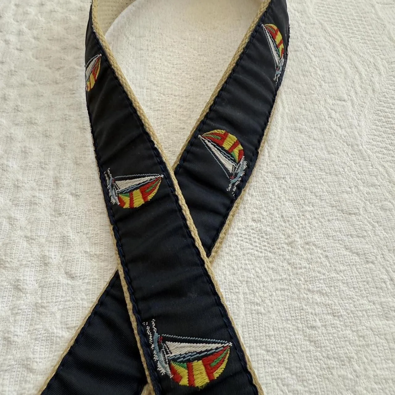 Belt is 39” from end to end, excluding buckle. Belt measurement is 36” as traditionally measured. In good used condition. Inner canvas material shows some minor discoloration. Exterior fabric with sailboats is in great shape!