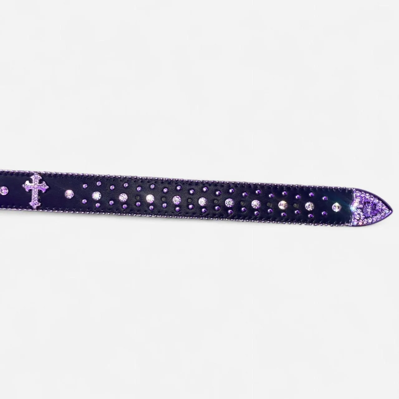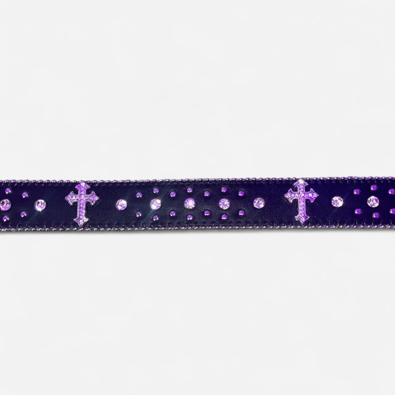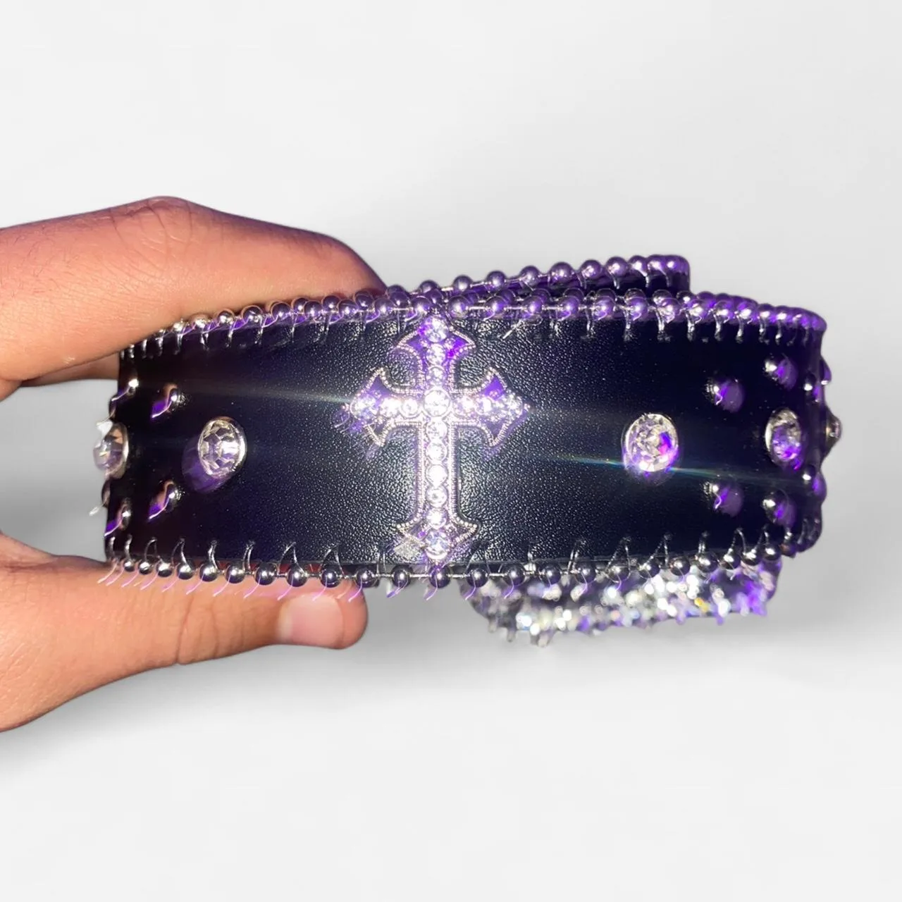 Chrome hearts style, the purple is just from my LED lights, the actual belt is purely silver and black.