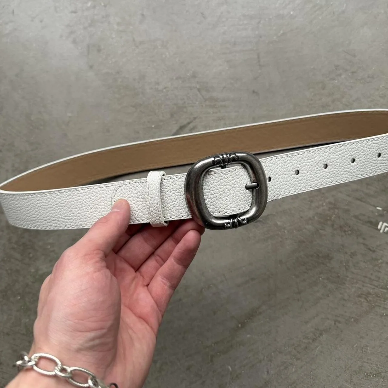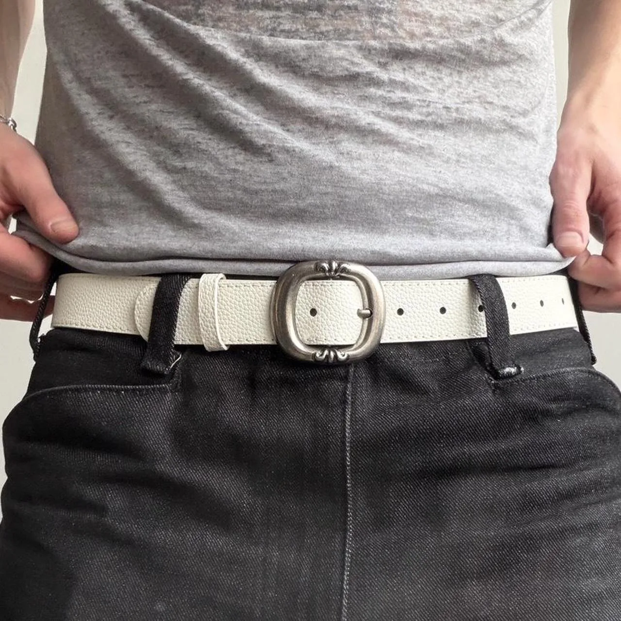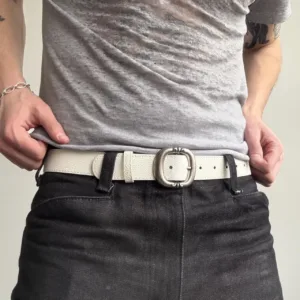 White leather belt with silver buckle Y2K inspired style