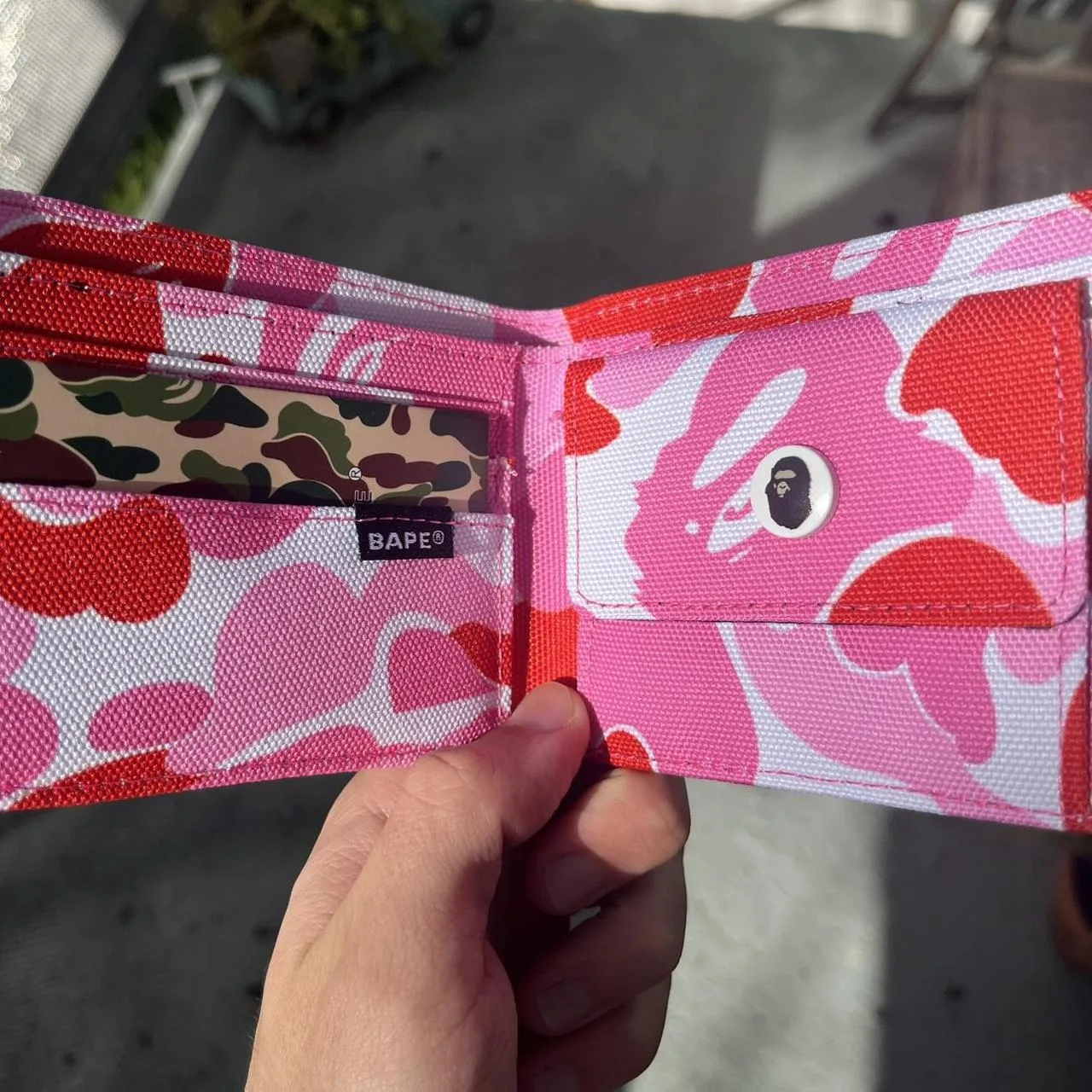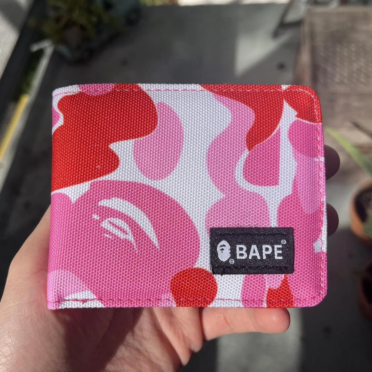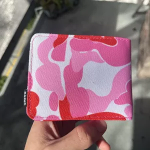 pink, wallet, BAPE, camouflage pattern, compact, colorful, streetwear, designer-inspired, bold print, accessory