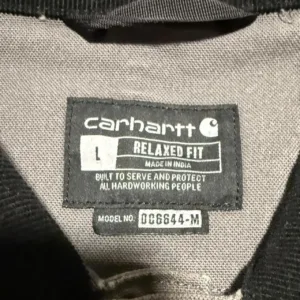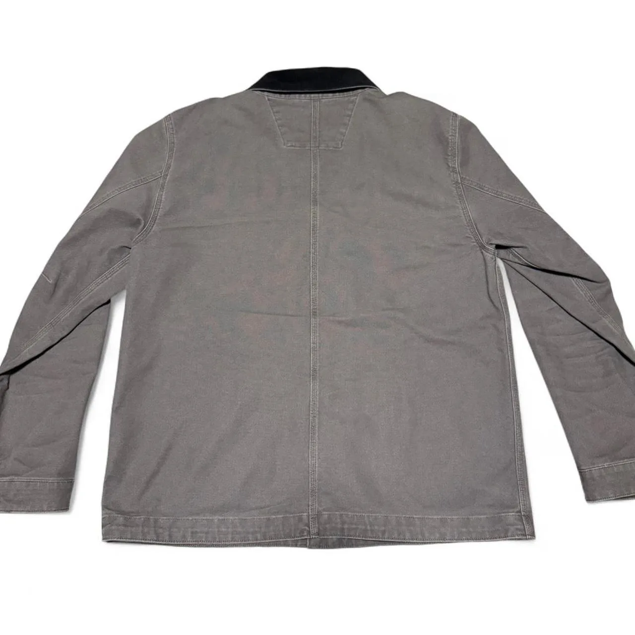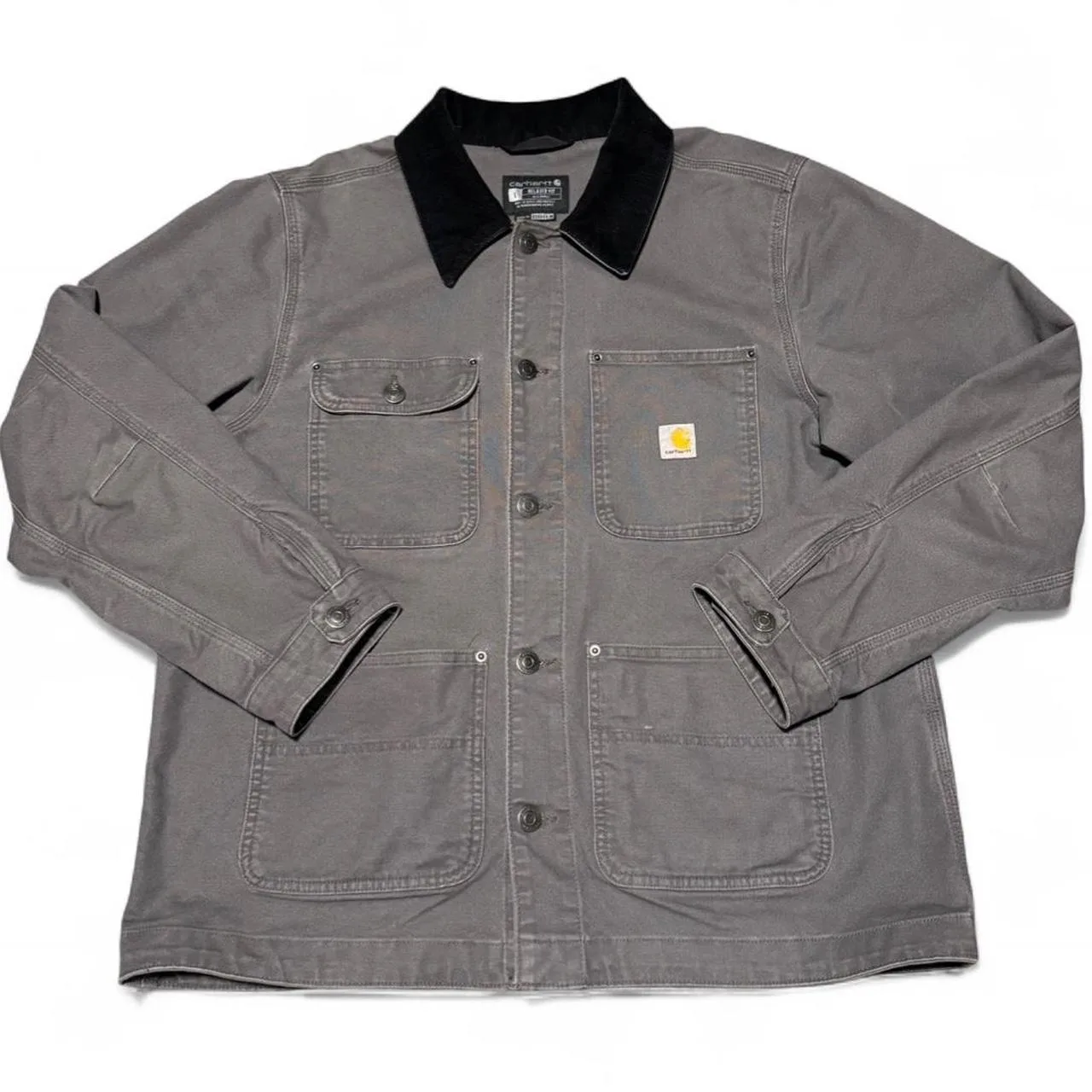 Carhartt chore coat, in a clean gray color with a black corduroy collar. Size Large, no rips or stains.
