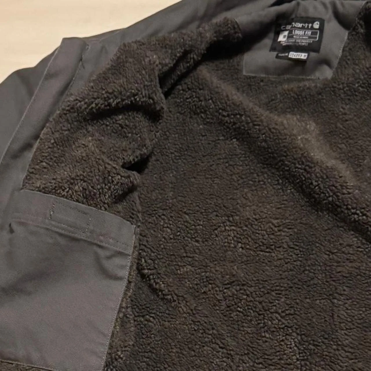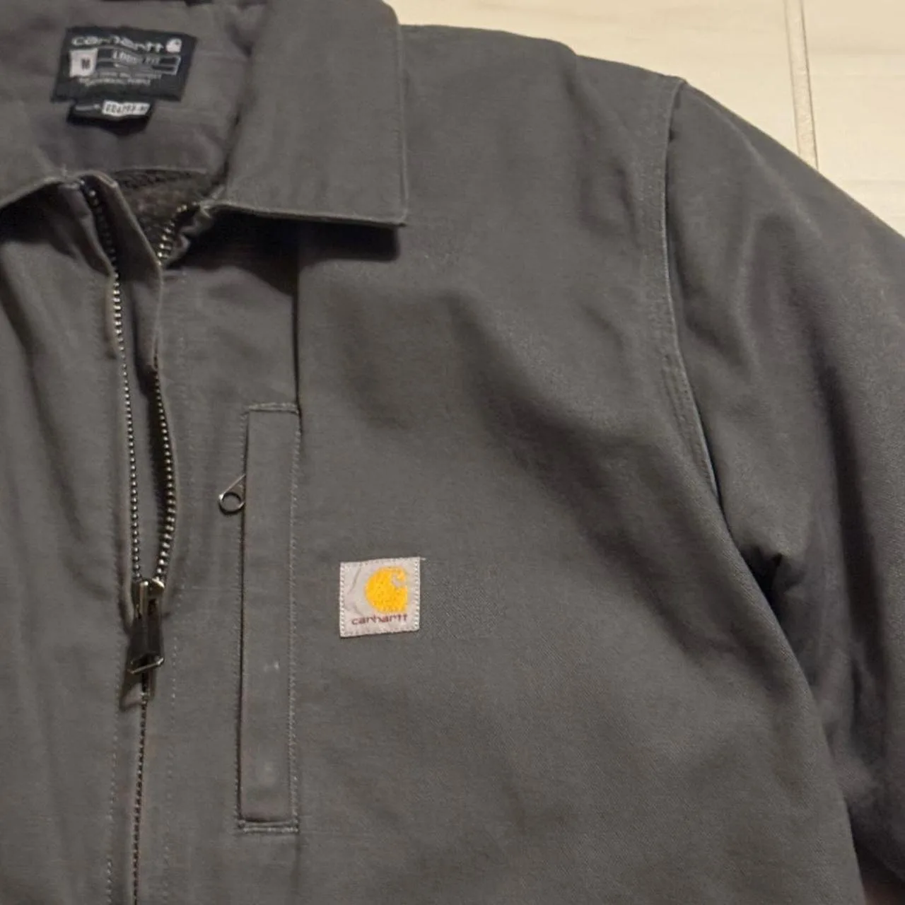Carhartt Men’s Loose Fit Washed Duck Sherpa-Lined Coat. Color is Gravel (dark grey). Size Medium. Fits like an XL though. Measurements 24in pit to pit. 31in top to bottom. Double zipper!! Extremely warm with Sherpa lining and 5 total pockets. Great winter jacket or spring/fall work and activities.