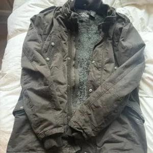 Hard edge military style coat / jacket in a taupe brown color. Super warm. Thrifted it this year just a little too big for me. Paid $30 x_x