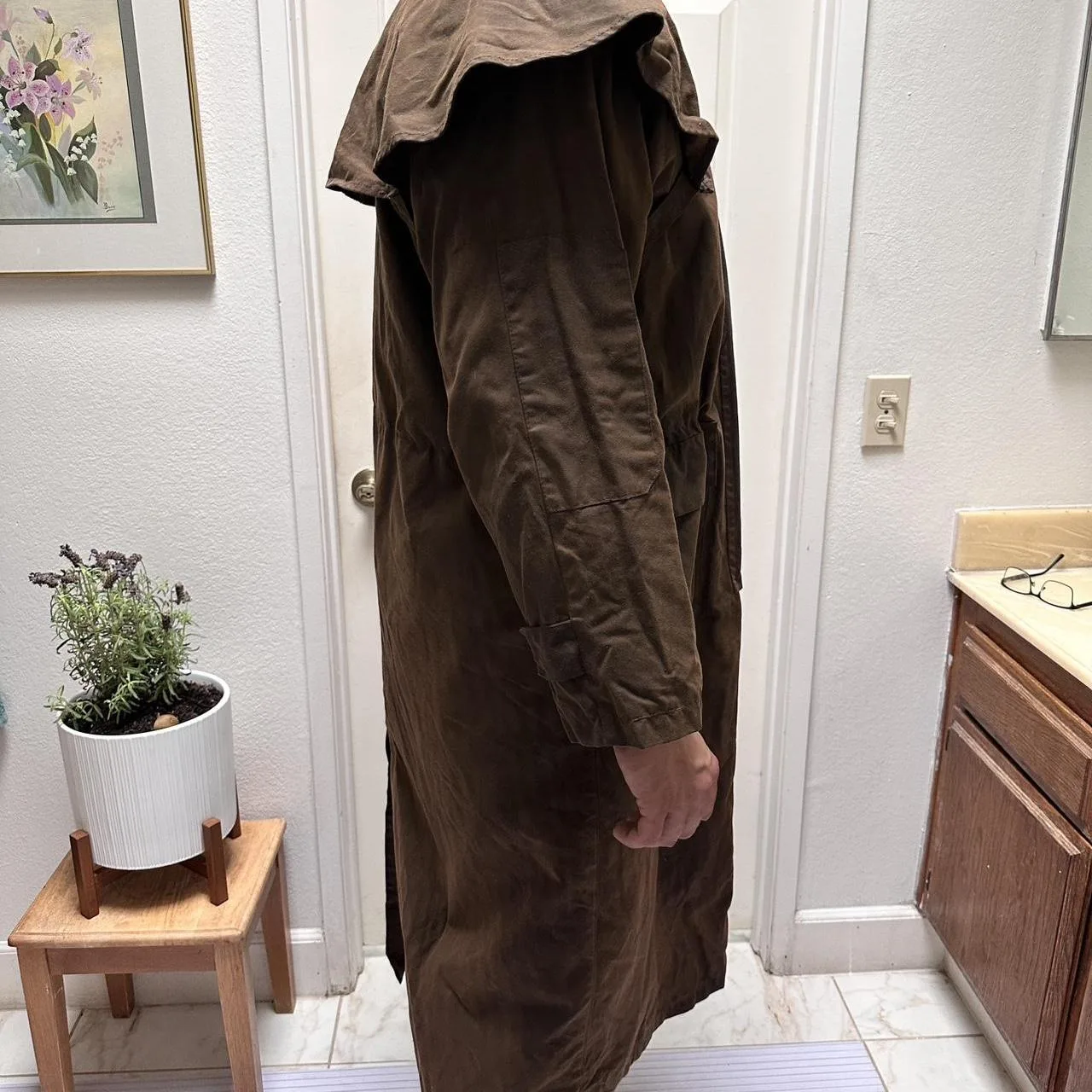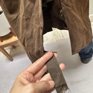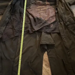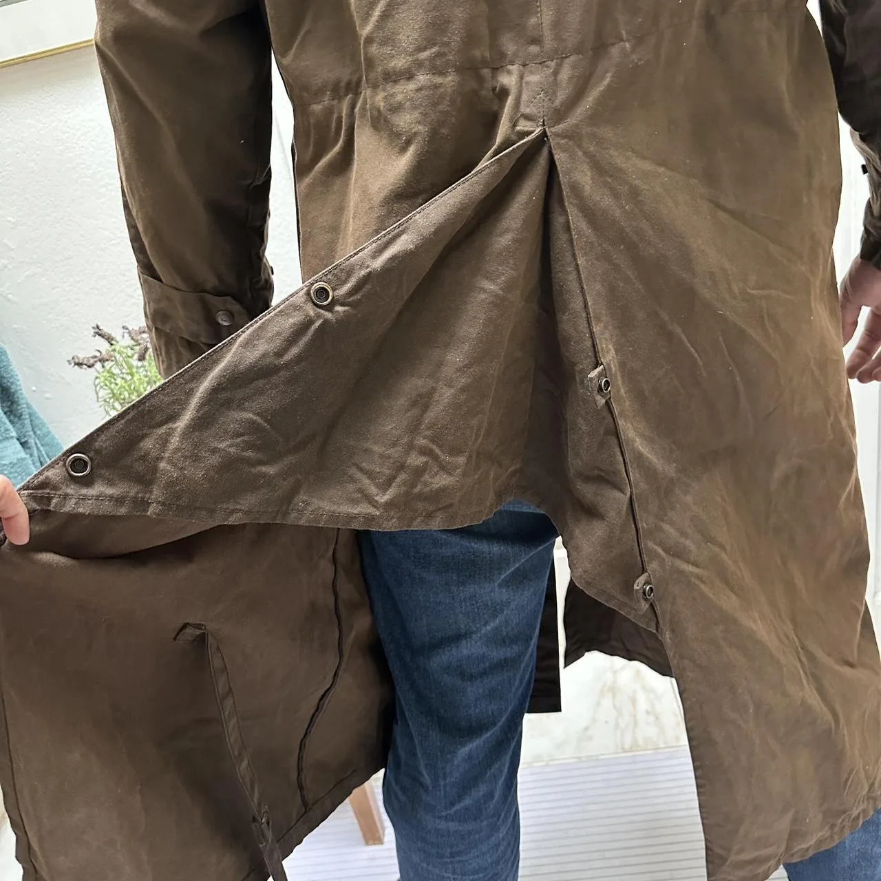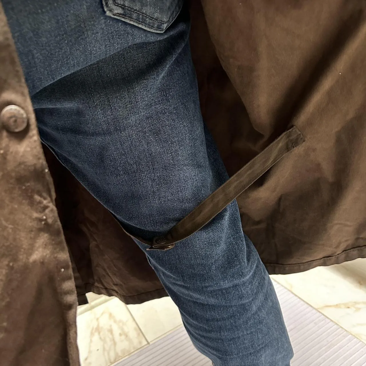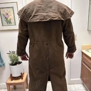 Brown waxed cotton canvas trench coat with a ton of details! Too many to show in the listing but it has a shoulder cover, several pockets inside and outside, straps that go around the legs although one is broken. And a bunch of buttons everywhere