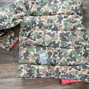 Vintage camo insulated down puffer zip up jacket with blaze orange liner. Good condition but there is a slit on the backside that has been patched up with duct tape as pictured, but that could easily be replaced with a patch or sewn! No tag follow measurements! Fits like a unisex M/L in my opinion!