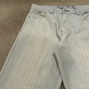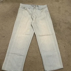light wash, distressed, vintage style, baggy fit, faded denim, casual wear, straight leg, relaxed fit, button fly, high rise