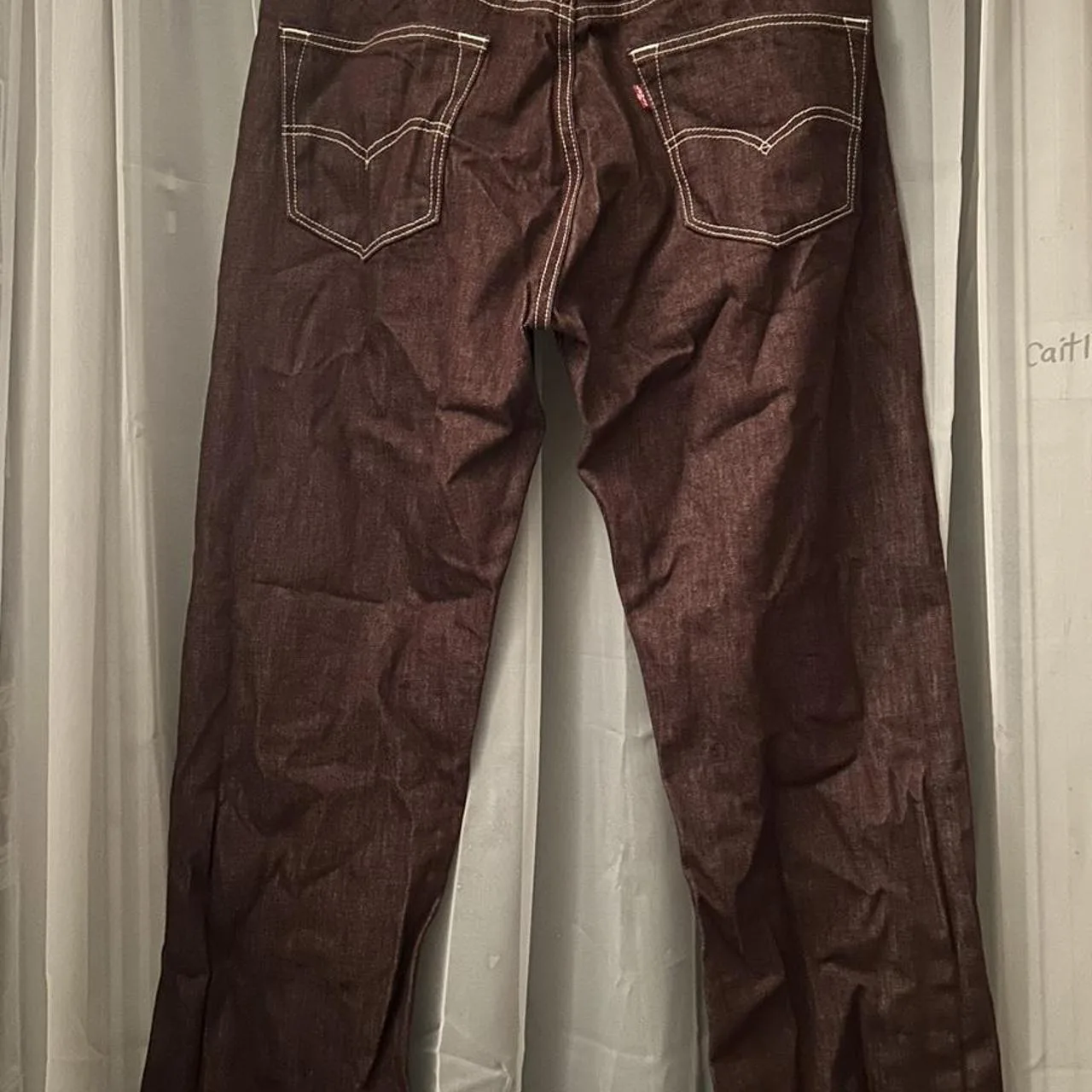 Brownish burgundy Levi’s 501 straight shrink to fit jeans W 34″ L 36″ but cut to about 30″