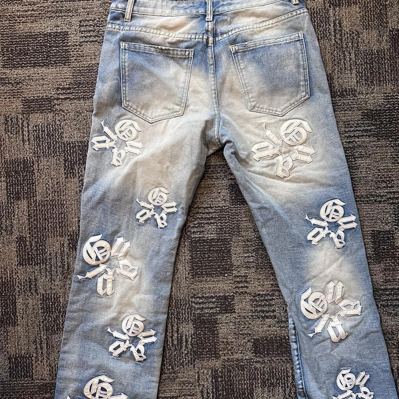 Ripped and patched blue and white jeans with 3D skulls #skater