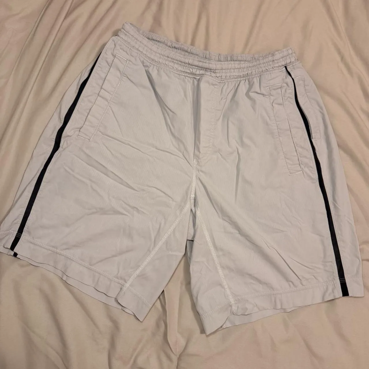Men’s Lululemon grey athletic shorts with black stripping detail. Size M