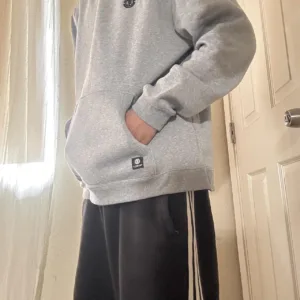grey hoodie, embroidered logo, casual wear, skater style, minimalist, neutral tones, pullover, versatile, streetwear, relaxed fit