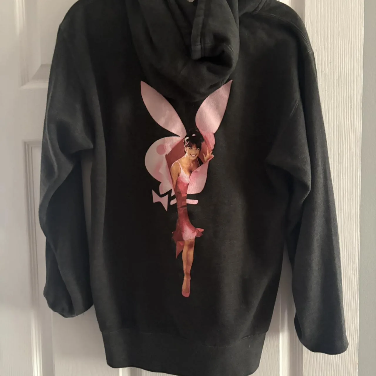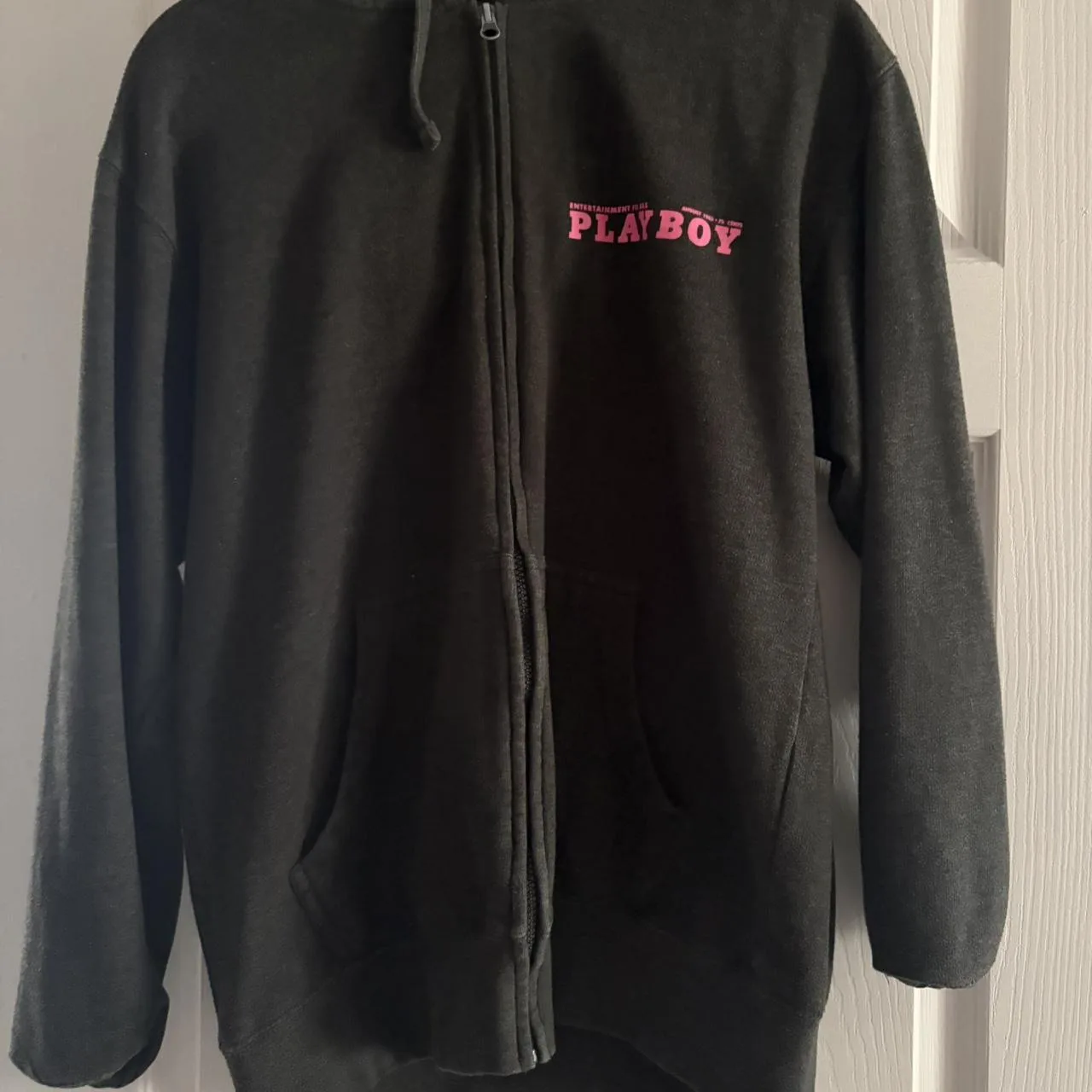 playboy logo, zip up jacket, black sweatshirt, athletic style, embroidered detail, casual wear, streetwear, sportswear, minimal design, logo branding