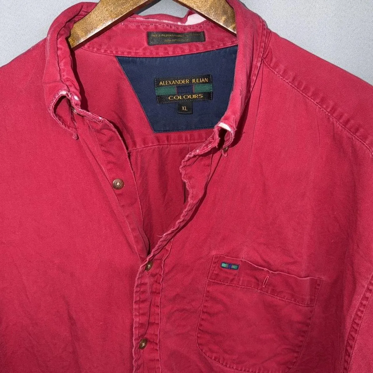 Alexander Julian Vintage Red button up shirt with a relaxed fit. Some tearing and flaws as indicated in photos. #menswear #shirts