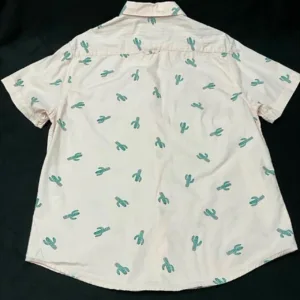 DENIM & FLOWERS MENS LARGE SHORT SLEEVE SHIRT. PINK WITH GREEN CACTUS DESIGN.