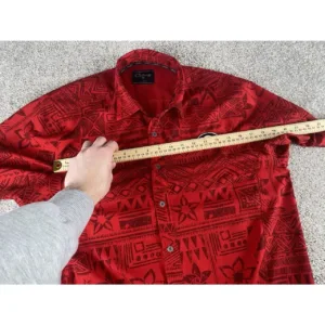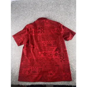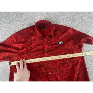 The product is a Georgia Bulldogs UGA Chiliwear Aztec Floral Hawaiian Red Shirt for men in size medium. This button-up shirt features a vibrant red color with a Hawaiian theme and Aztec floral pattern, making it a unique and stylish addition to any fan’s wardrobe. Made of polyester material, this short sleeve shirt is perfect for casual wear and showing support for the Bulldogs in a fun and fashionable way.