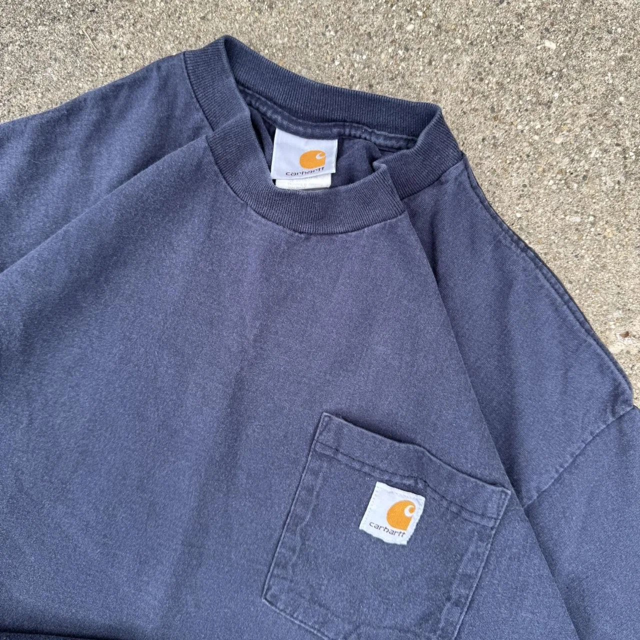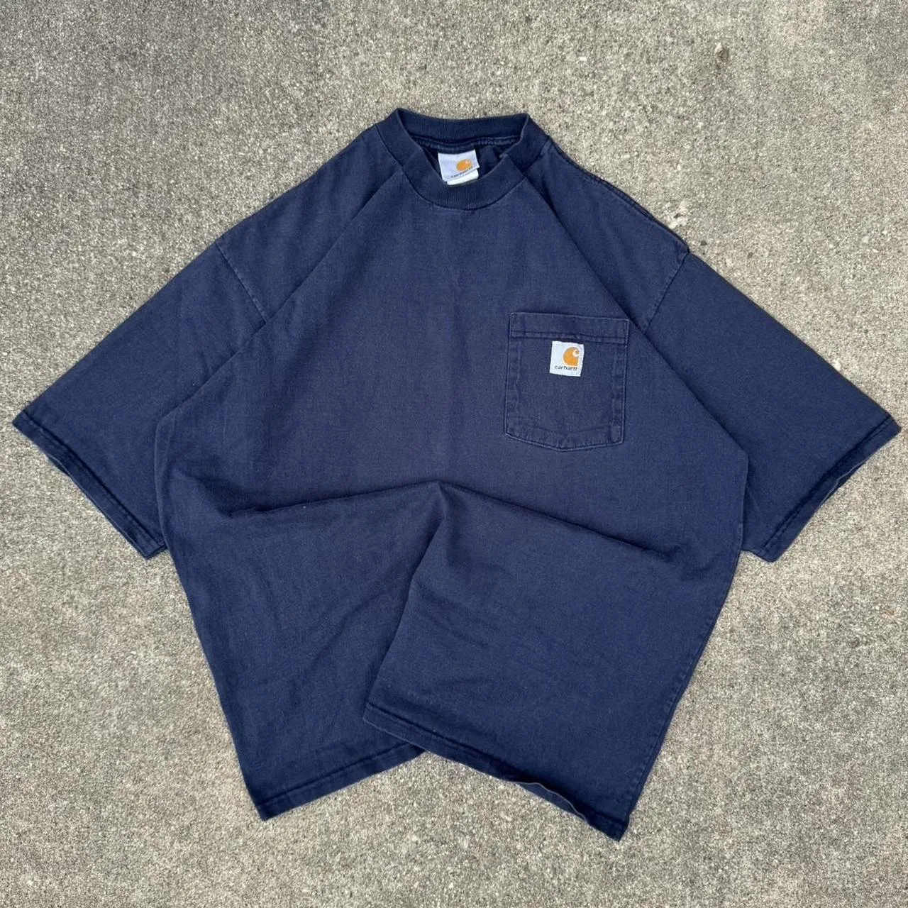 retro graphic, oversized fit, distressed, faded print, casual streetwear, baggy style, workwear-inspired, navy blue, relaxed fit, classic silhouette