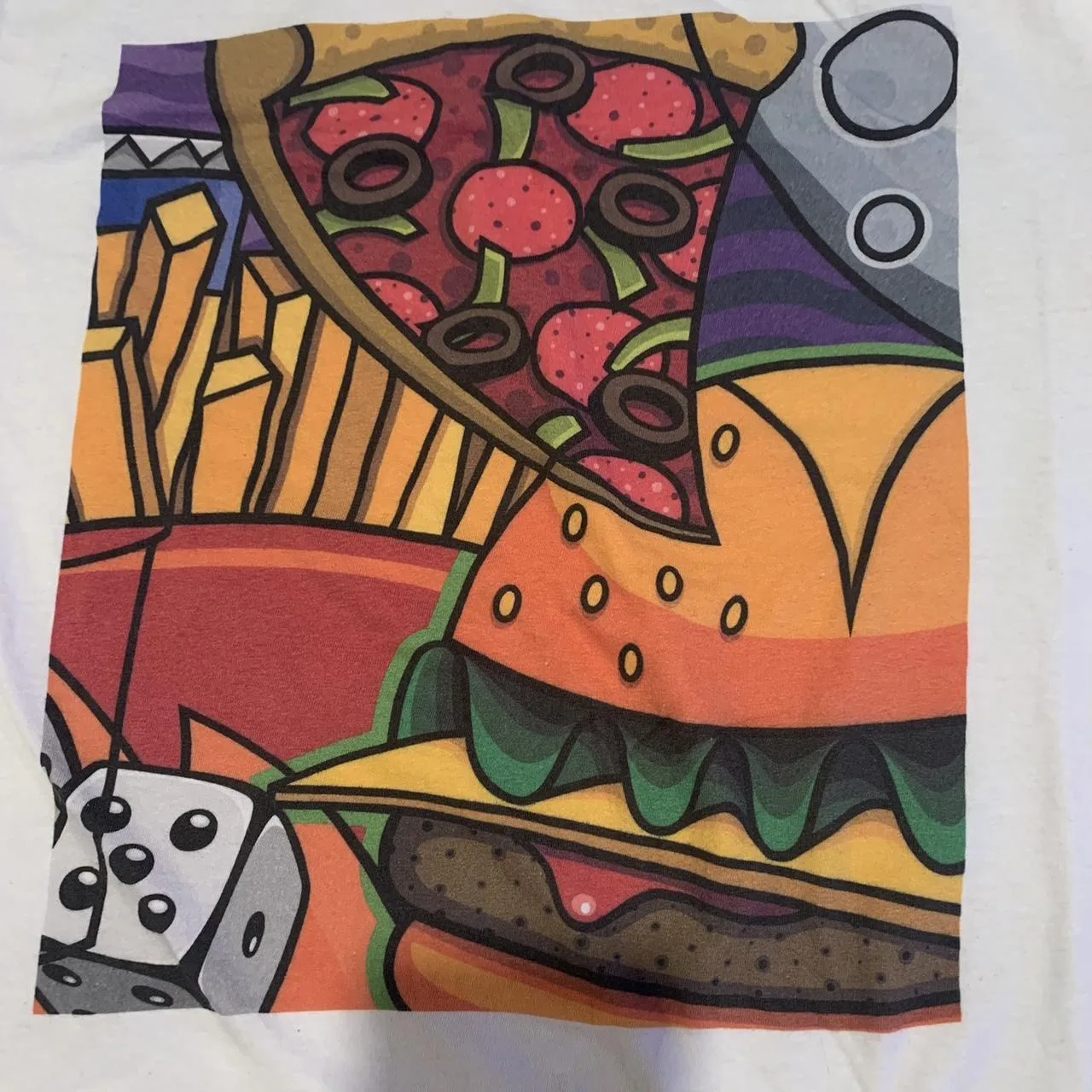 graphic print, multicoloured design, streetwear style, vintage aesthetic, bold artwork, casual tee, retro vibe, fast food stickers, urban fashion, oversized fit