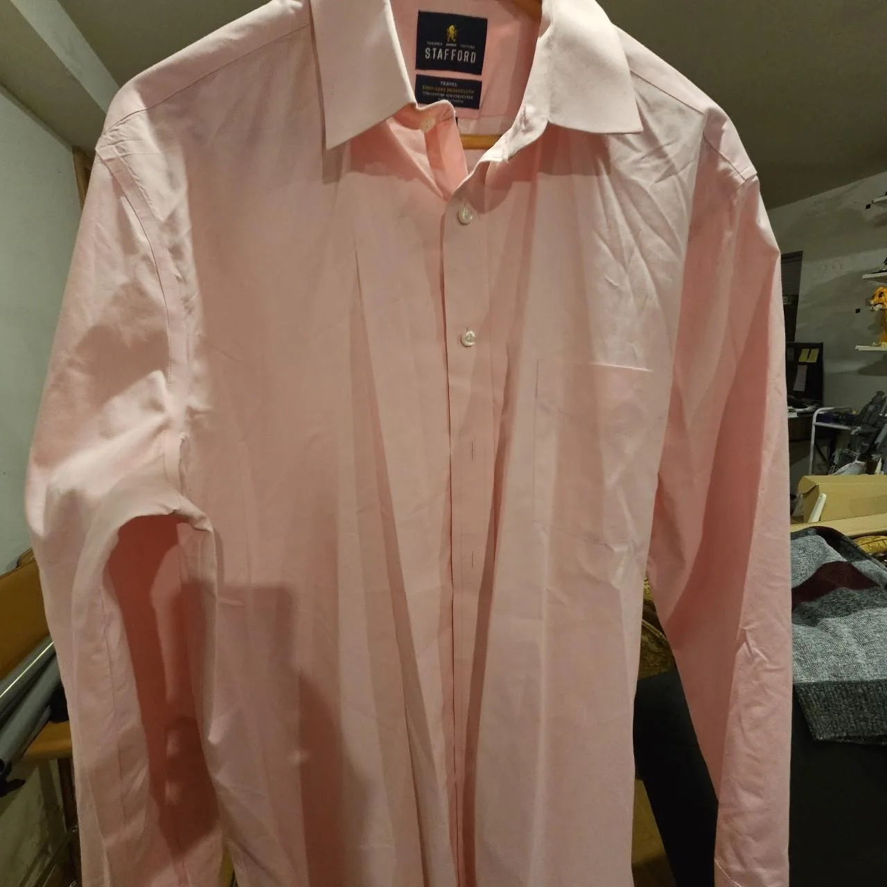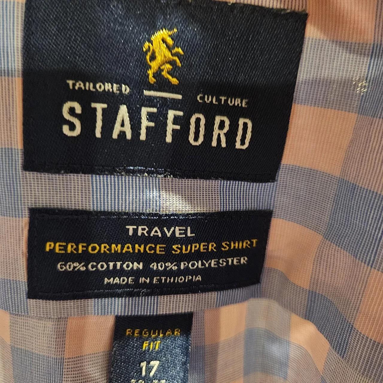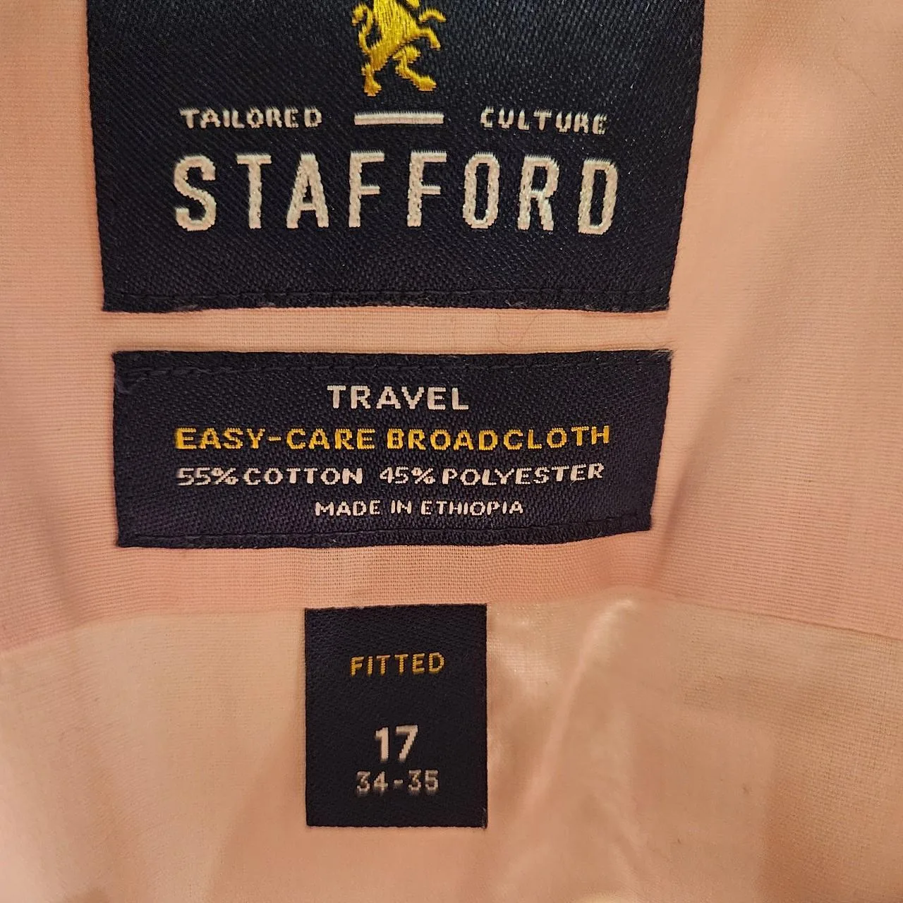 2 Stafford Men’s dress shirts. Features easy-care broadcloth fabric, a blend of 55% cotton and 45% polyester. Made in Ethiopia. Size 17, 34-35.