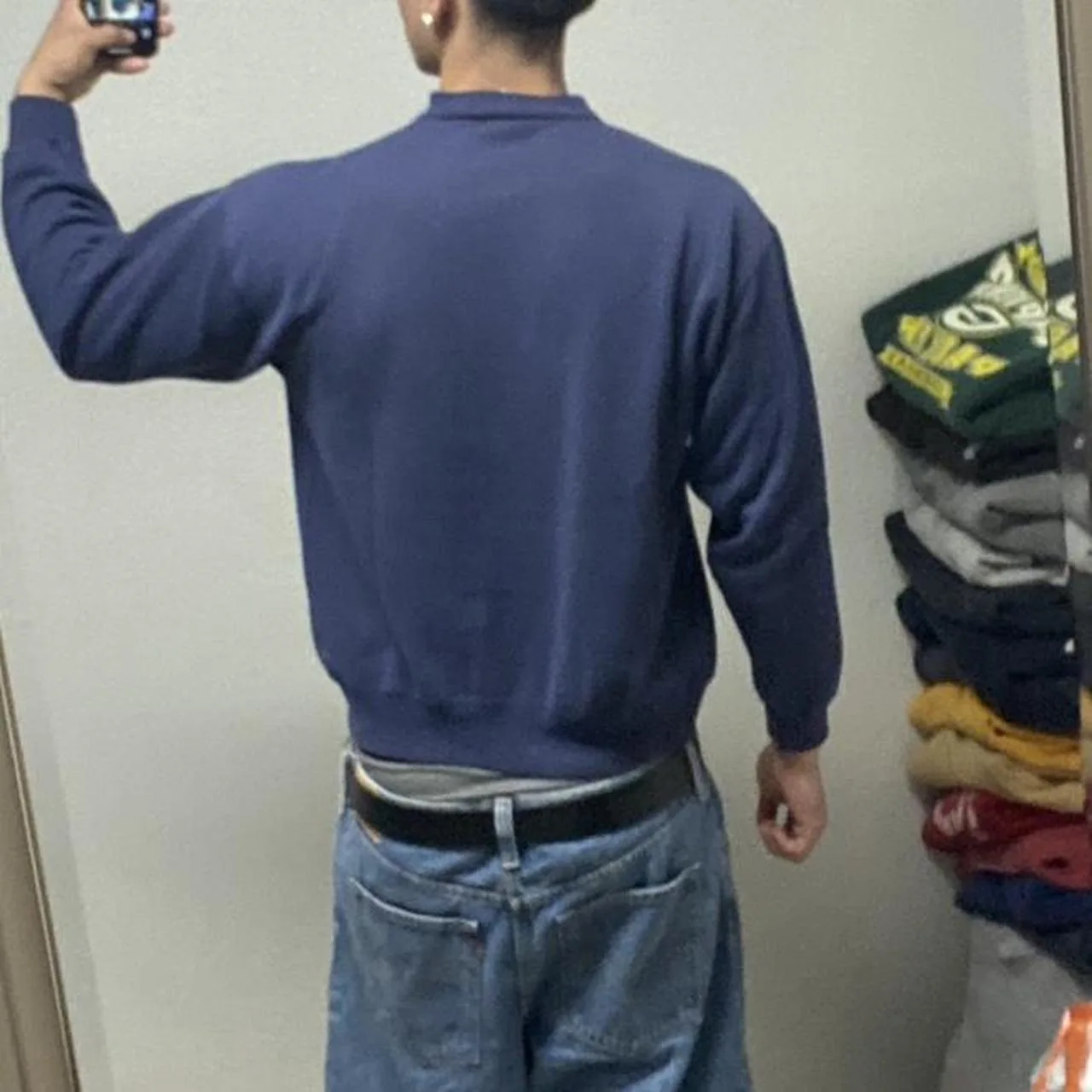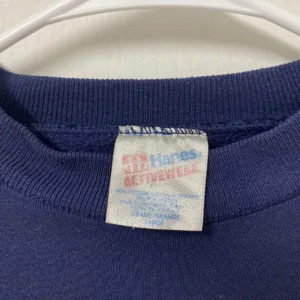 navy blue, graphic sweatshirt, vintage sportswear, oversized fit, retro athletic, soft fleece, team logo, casual streetwear, minor flaw, 90s inspired