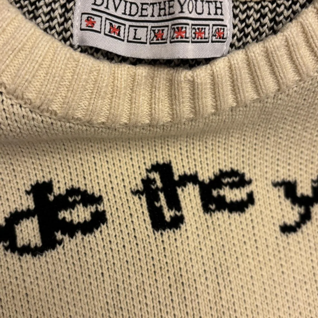 Divide the youth sweater, fits a little snug, large. Cool angle and devil print