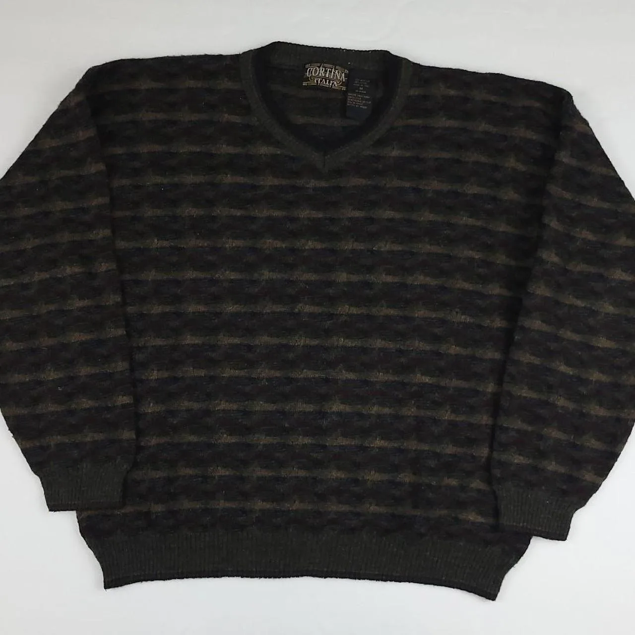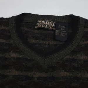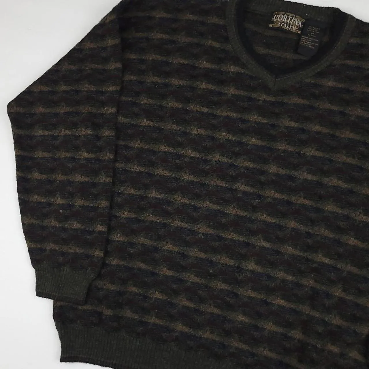 Vintage Cortina wool blend multicolor pattern sweater. Super cool unique piece and nice quality, thinner lightweight knit wool blend v neck with unique colorful design. Great condition, has light general wear