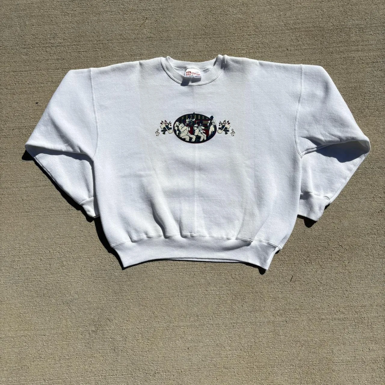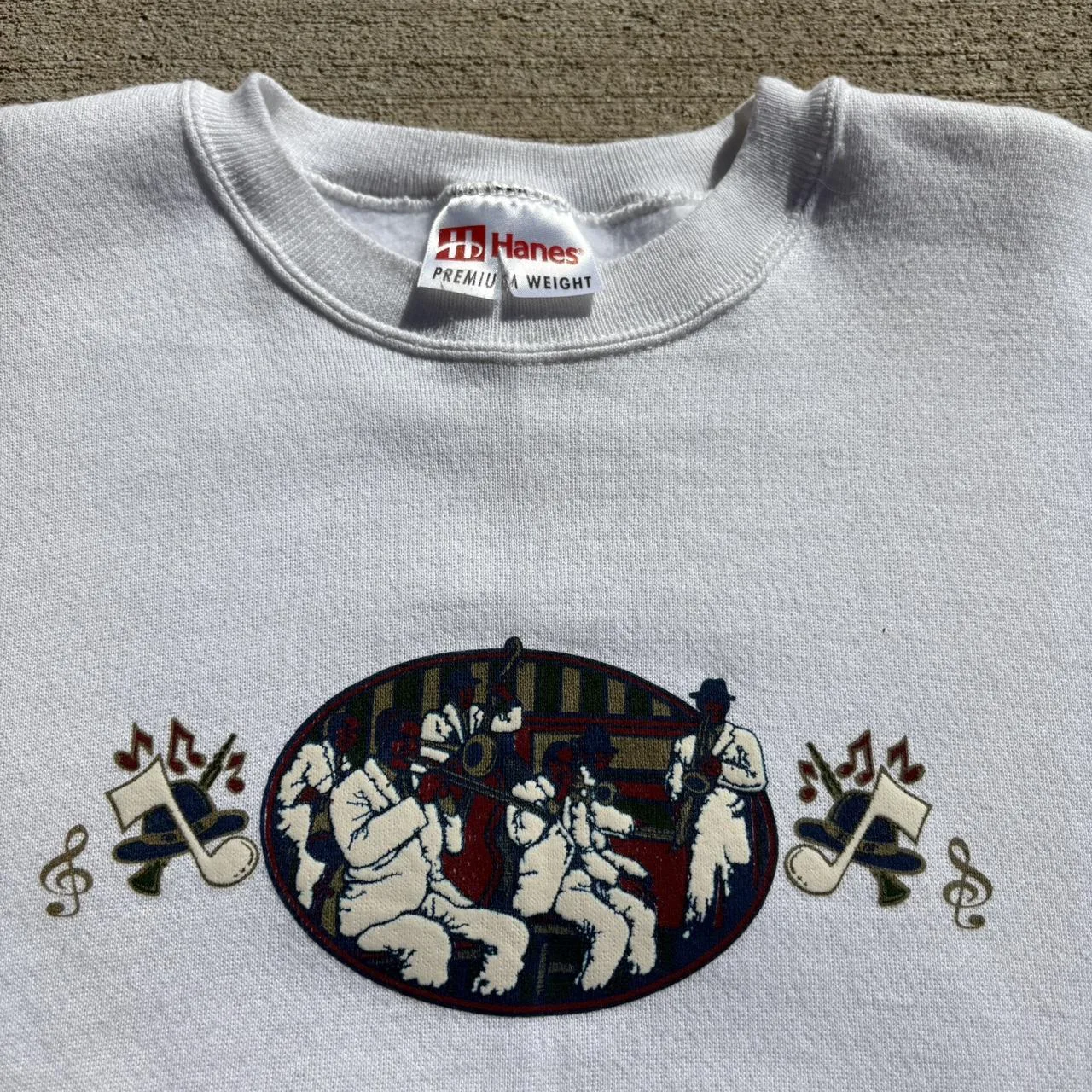 retro knit, oversized fit, jazz motif, vintage sweatshirt, 90s style, distressed, cozy fleece, music-inspired, cropped, casual layer