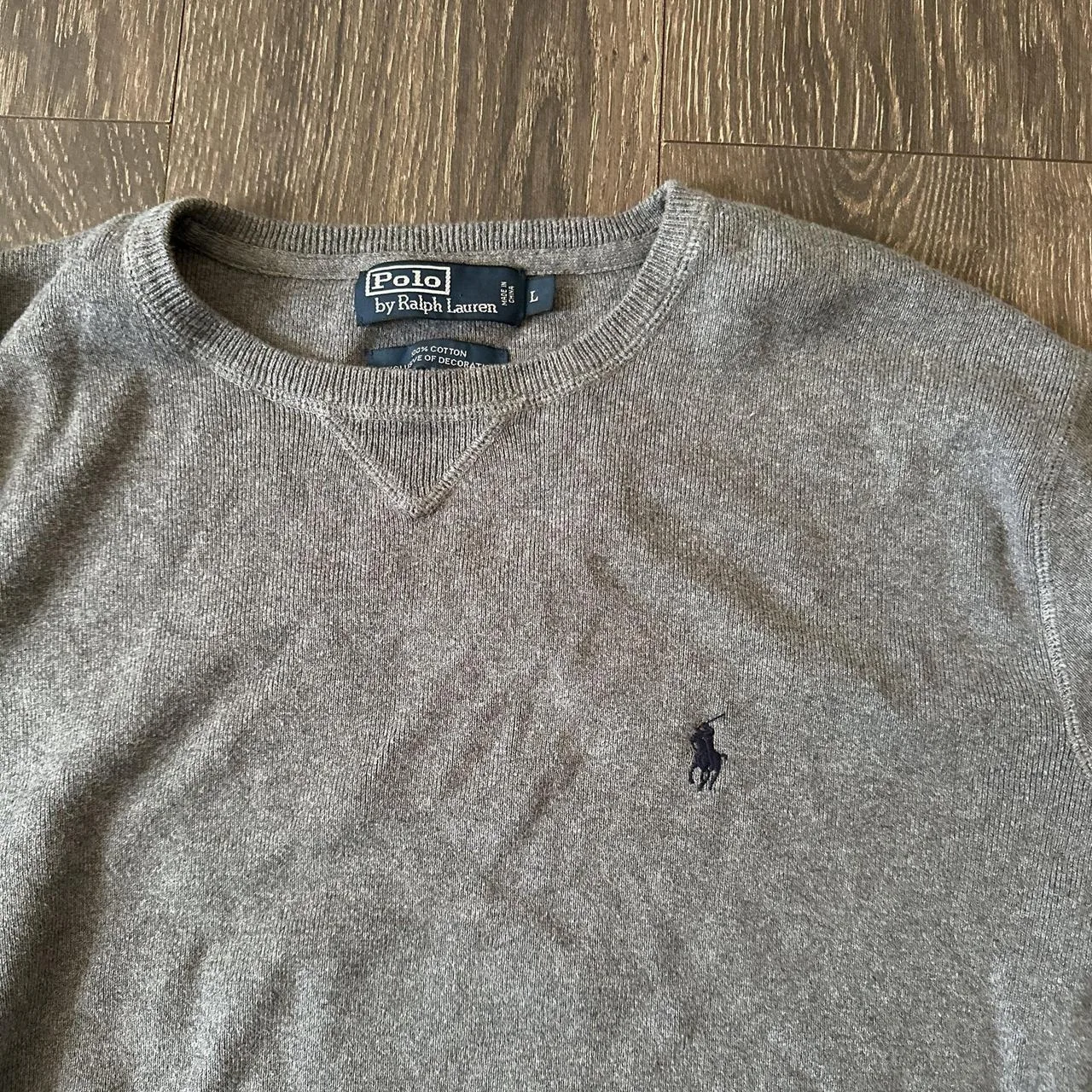 Polo Ralph Lauren Gray Pima Cotton Crewneck Sweater, Size Large. Crafted from soft Pima cotton, this classic crewneck features the iconic embroidered Polo Pony logo on the chest. Perfect for versatile layering or casual wear. Excellent pre-owned condition, no visible flaws.
