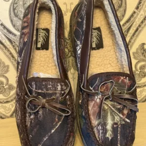 camo, moccasin slippers, camouflage, outdoor-inspired, rugged, slip-on, cozy footwear, rustic style, earthy tones, casual indoor