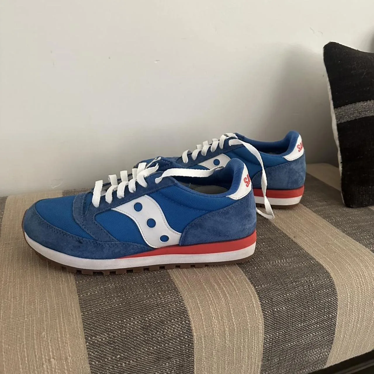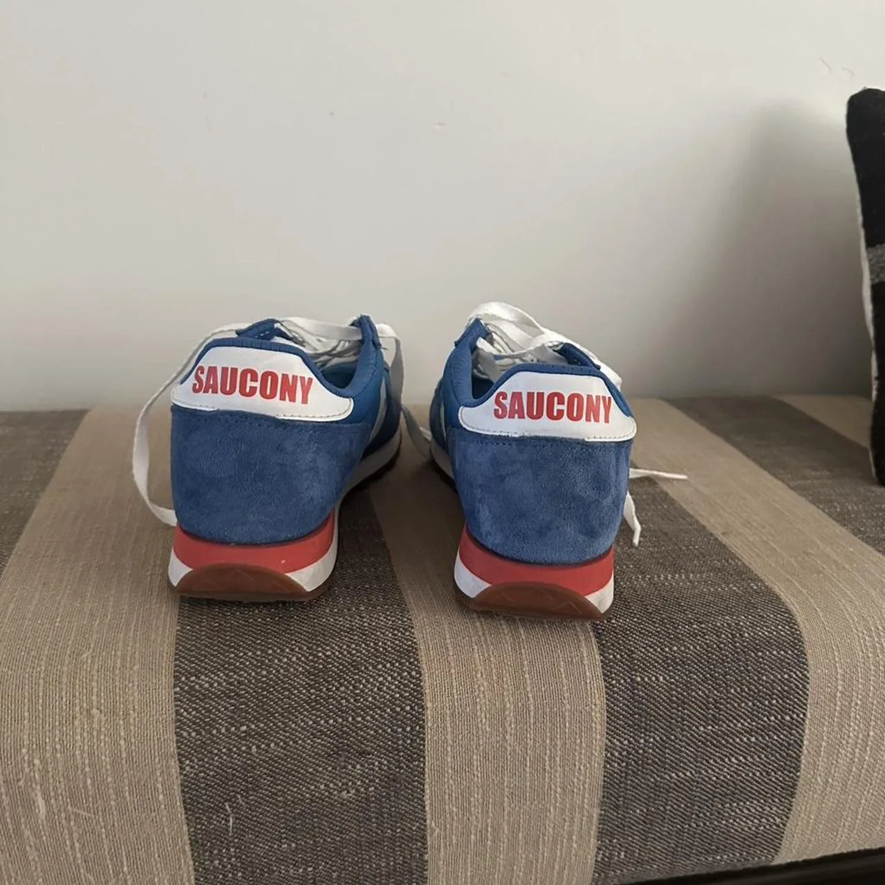 blue sneakers, unisex athletic, Saucony shoes, casual kicks, running sneakers, sporty footwear, comfortable trainers, lace-up sneakers, retro style, men’s size 8