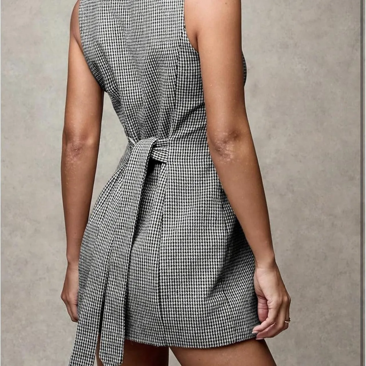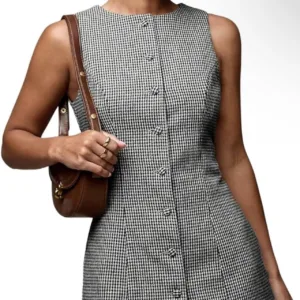 Grey and white gingham sleeveless mini dress with button front and tie waist #preppy #minidress