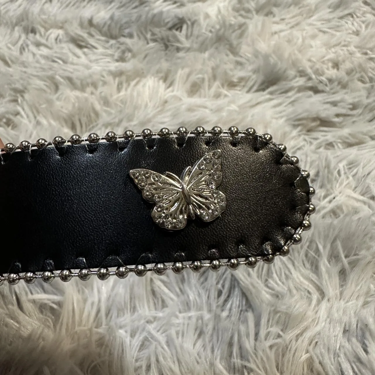 butterfly hardware, beaded trim, gothic accessory, glam style, adjustable belt, statement accessory, ornate buckle, silver accents
