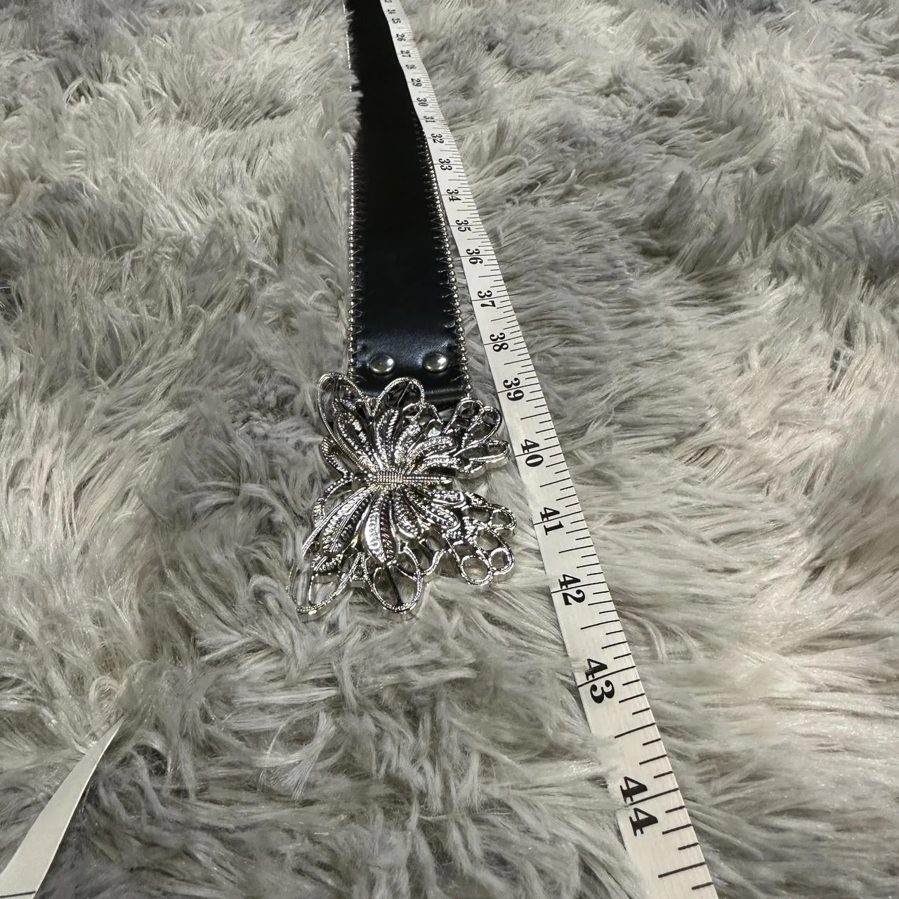 ?? Details: Large butterfly buckle, butterfly tip accent, beaded edge trim, decorative grommets, non-leather material