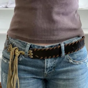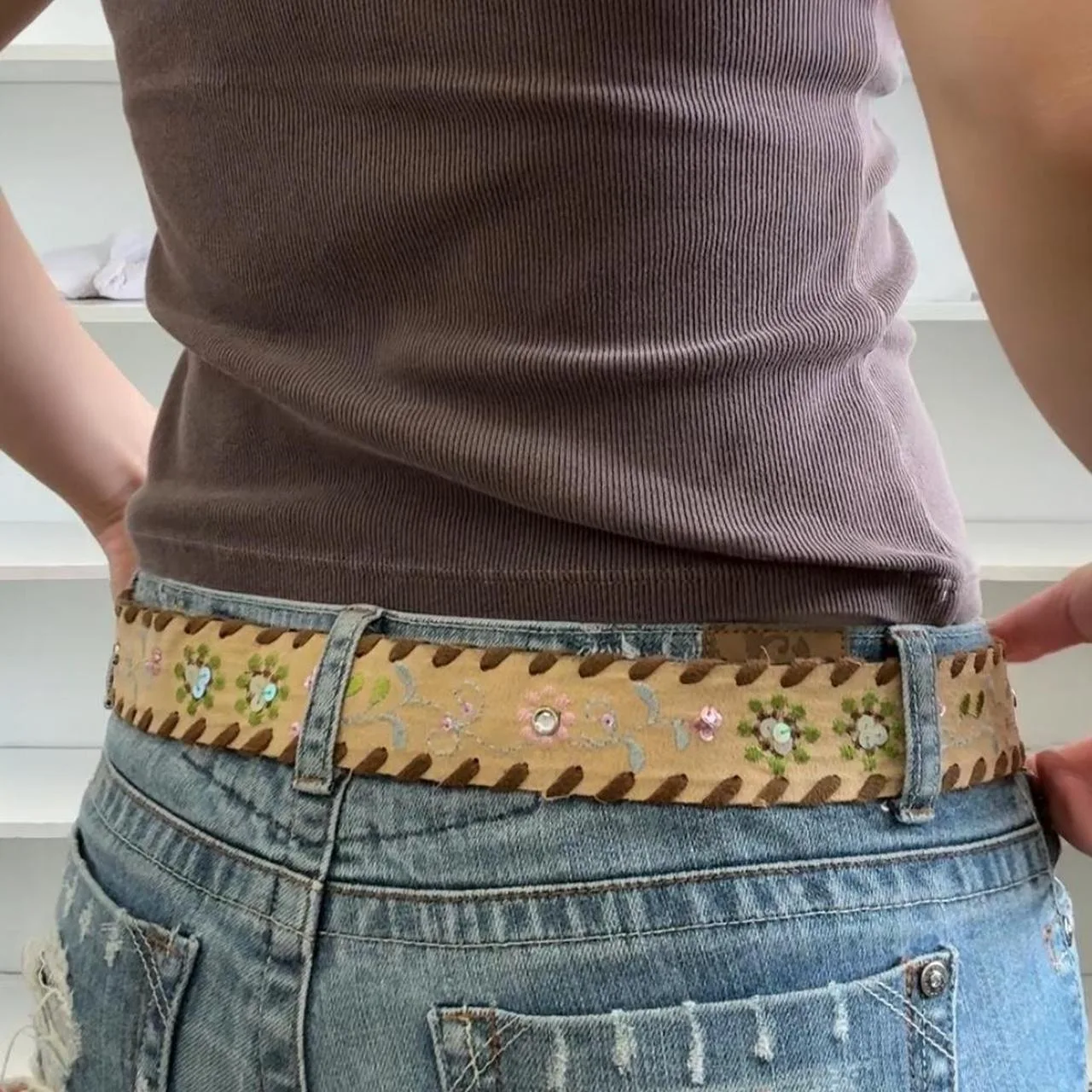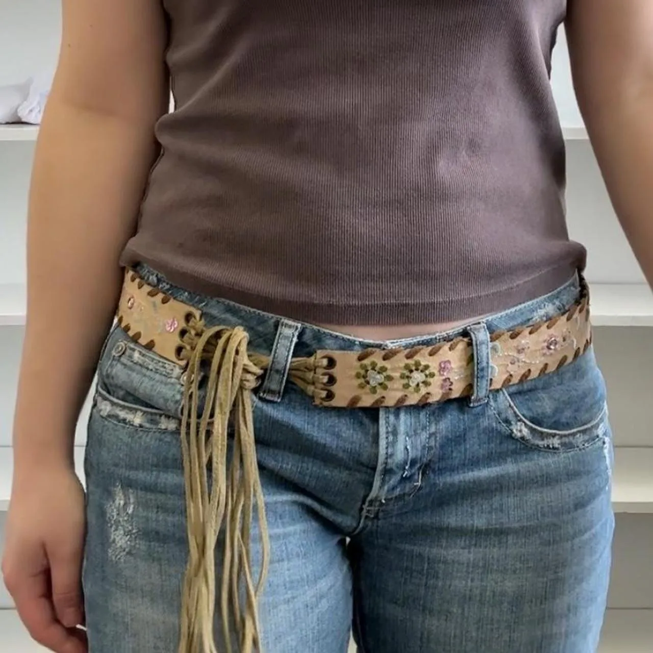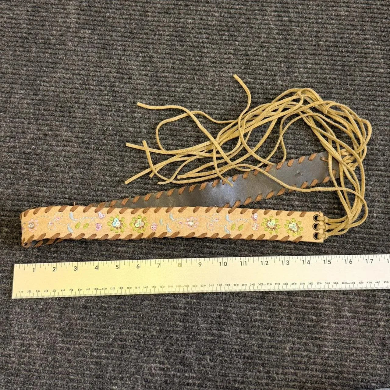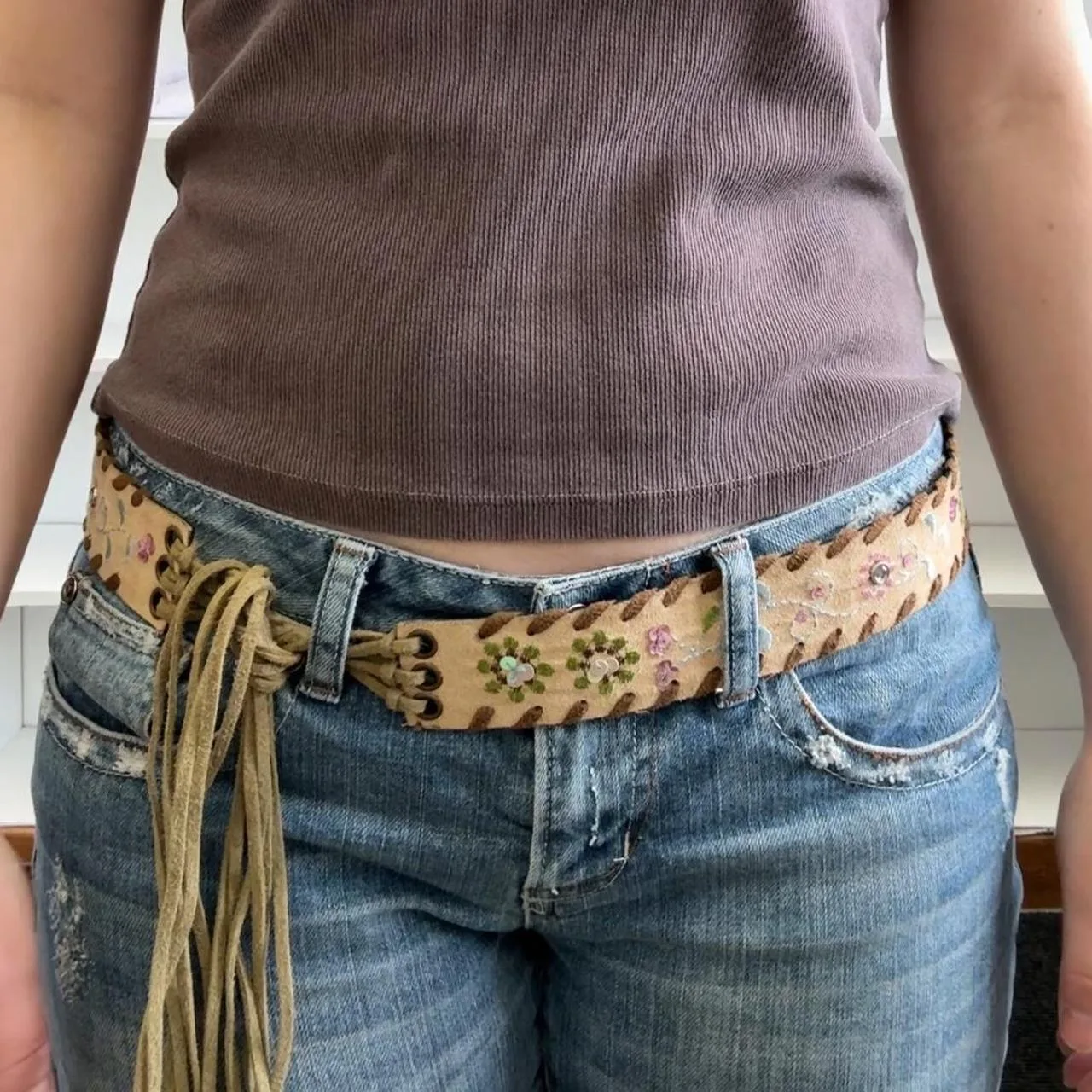 Y2K Boho tan belt with fringe and embroidery and sequin details, can be reversed to dark brown /black