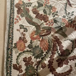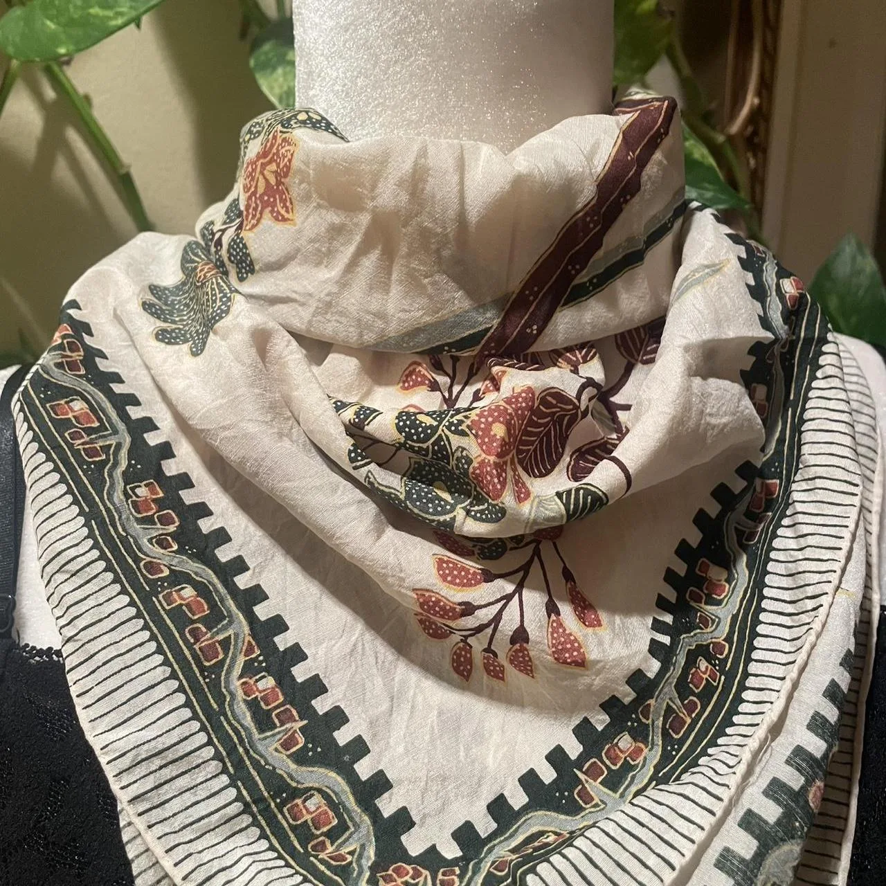 🤎 dreamy neutral floral scarf ~cream base with earthy green + muted red detailing~perfect for layering all year round. Gives major cottagecore / boho / vintage market vibes.