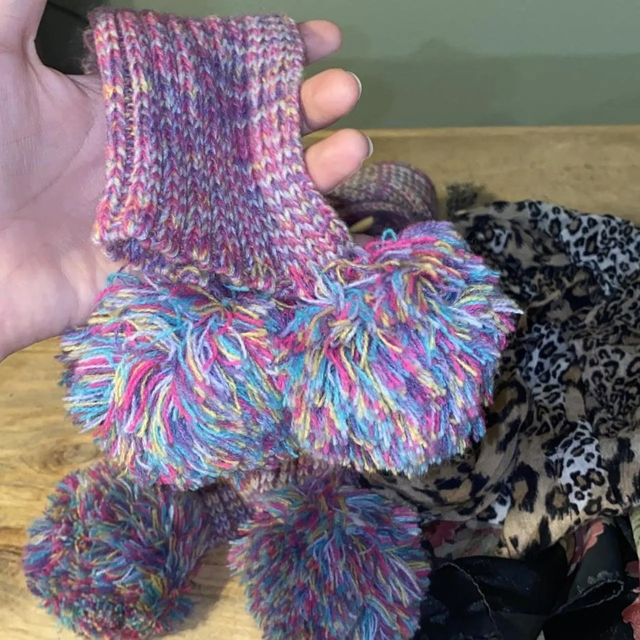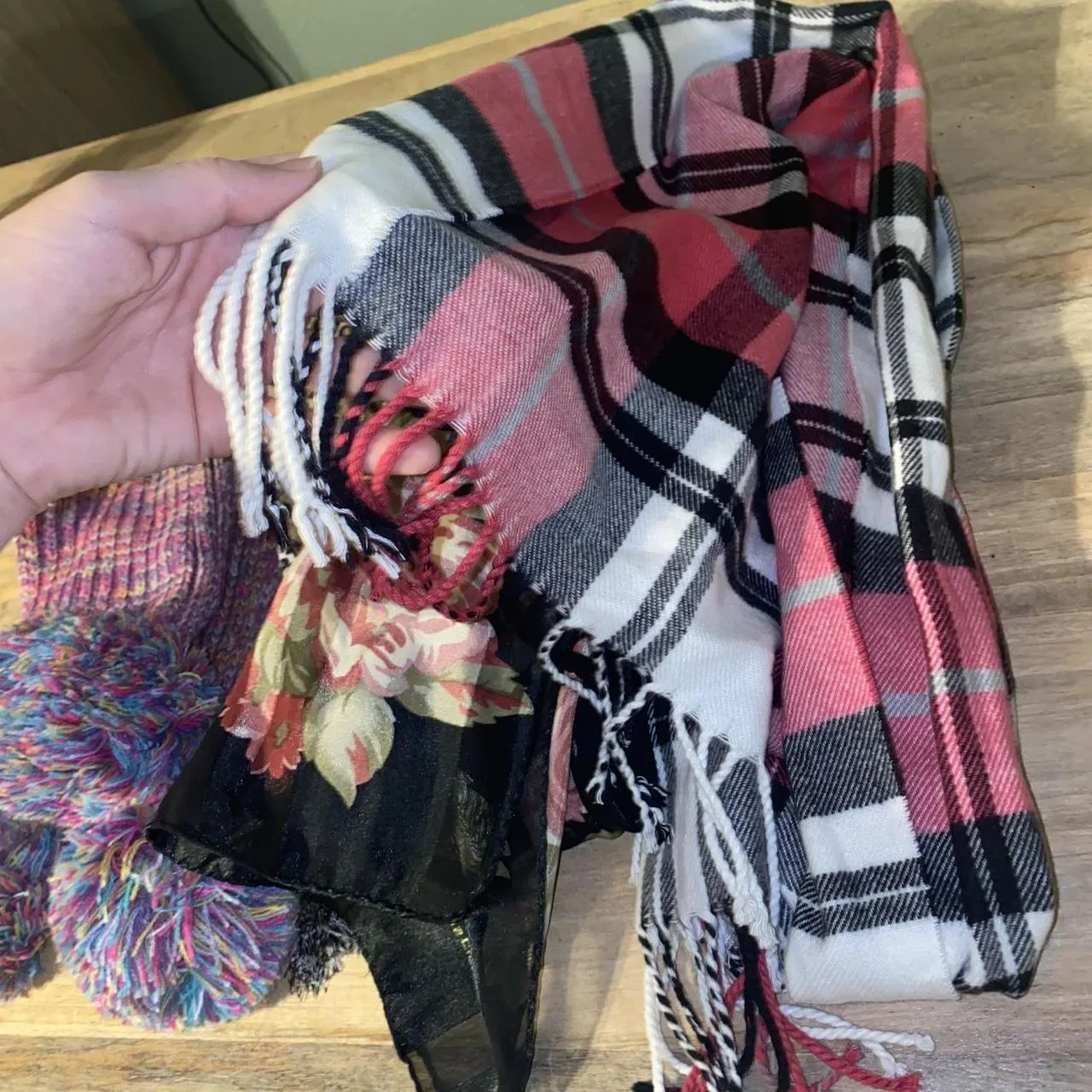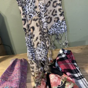 Bundle of four scarves! Free shipping! We got pink and black plaid, black floral, cheetah print, and a cute pink, purple and green pom pom scarf!