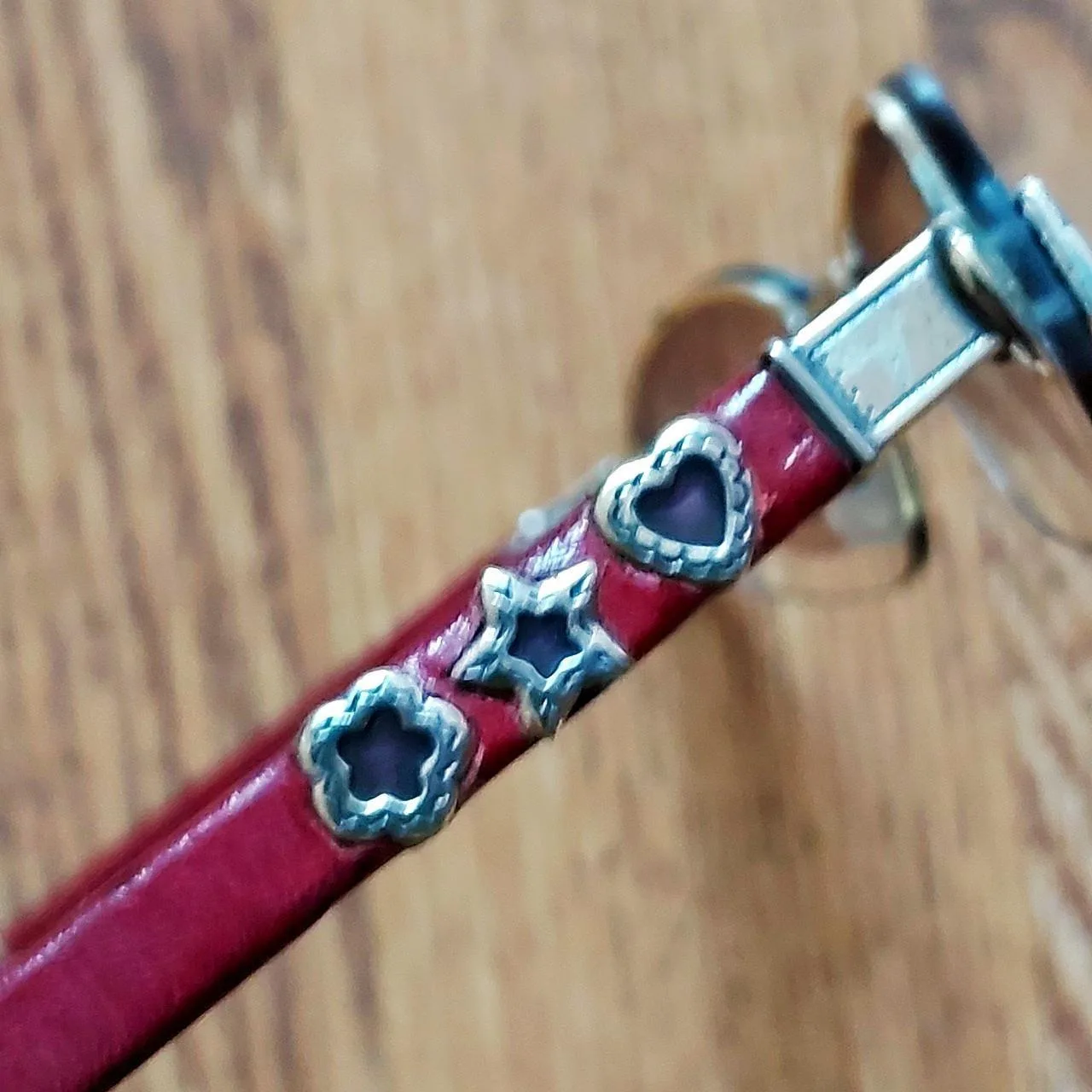 Brighton Handmade “Misty” sunglasses with heart and star details, gradient ping grey lens, leather lined arm