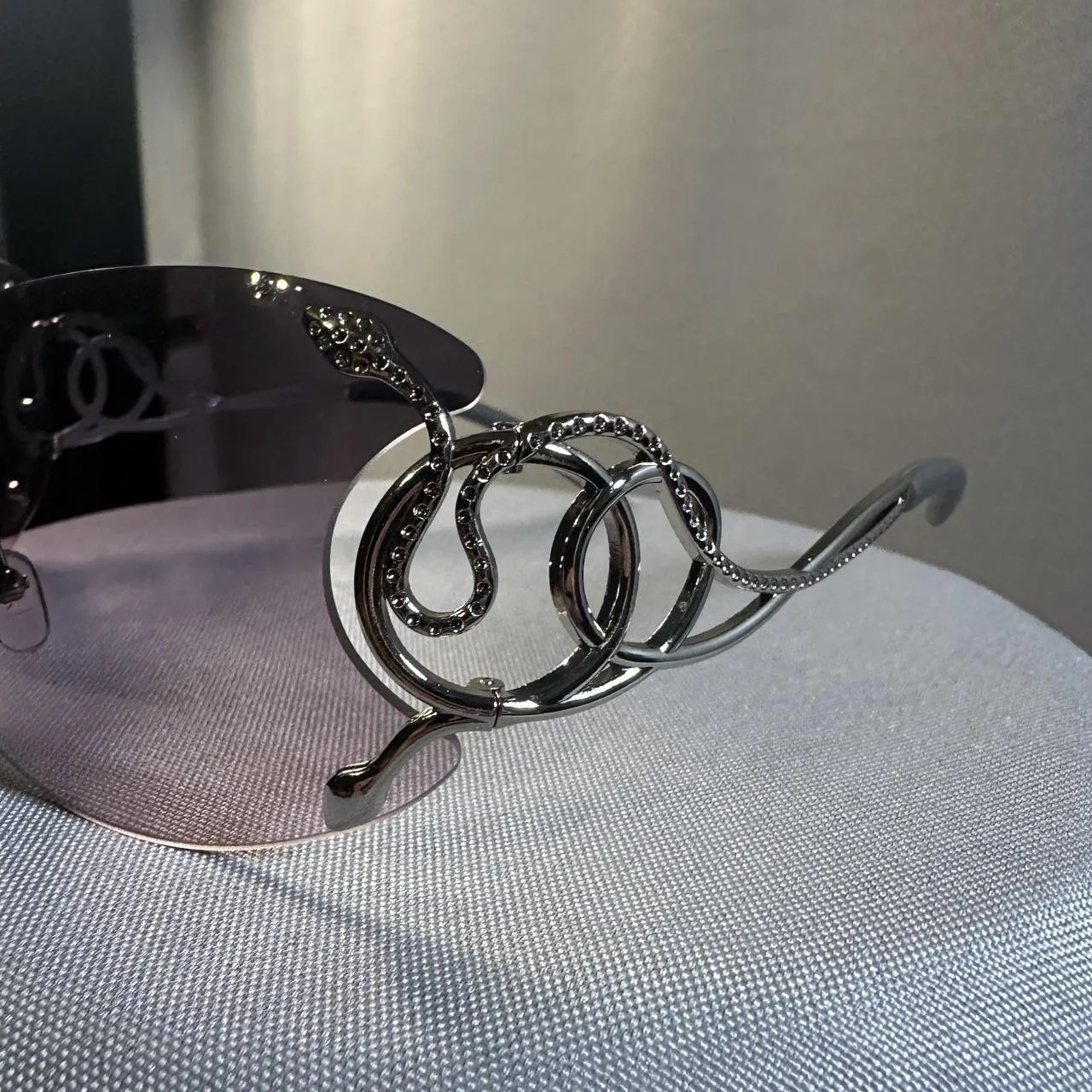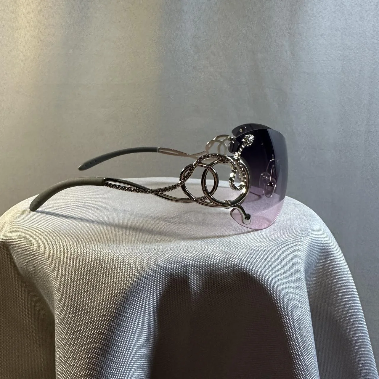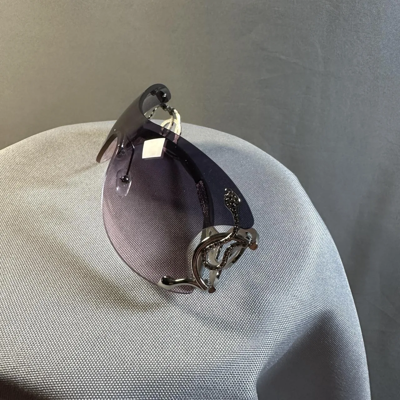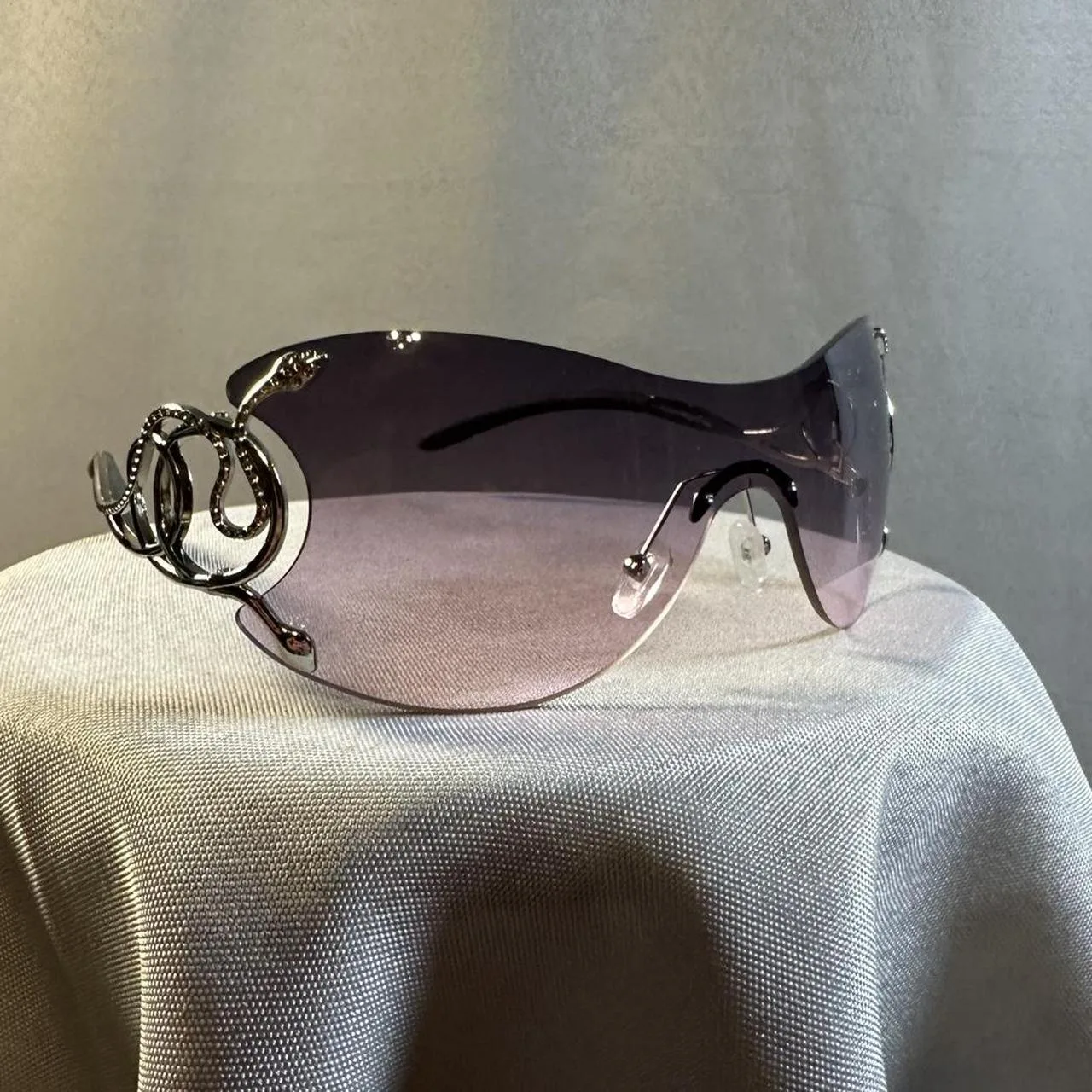 purple gradient, snake detail, oversized, curved lens, metallic accents, glam accessory, Y2K style, statement eyewear, futuristic design, collectible sunglasses