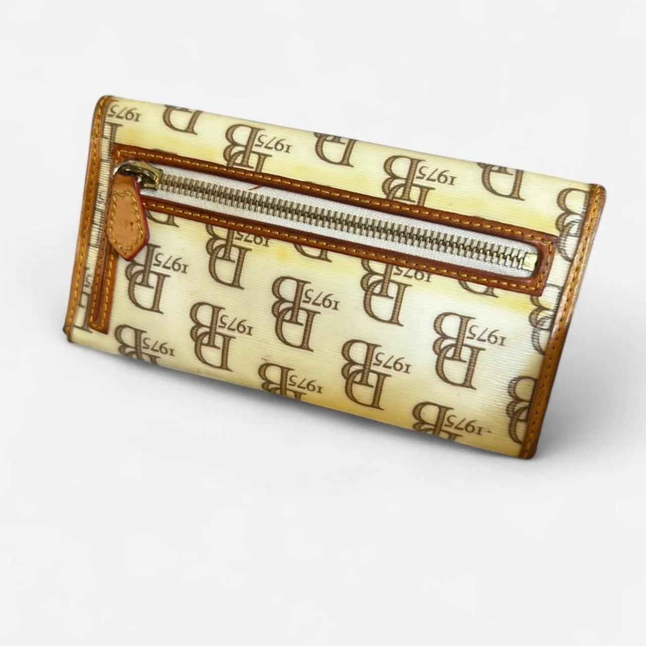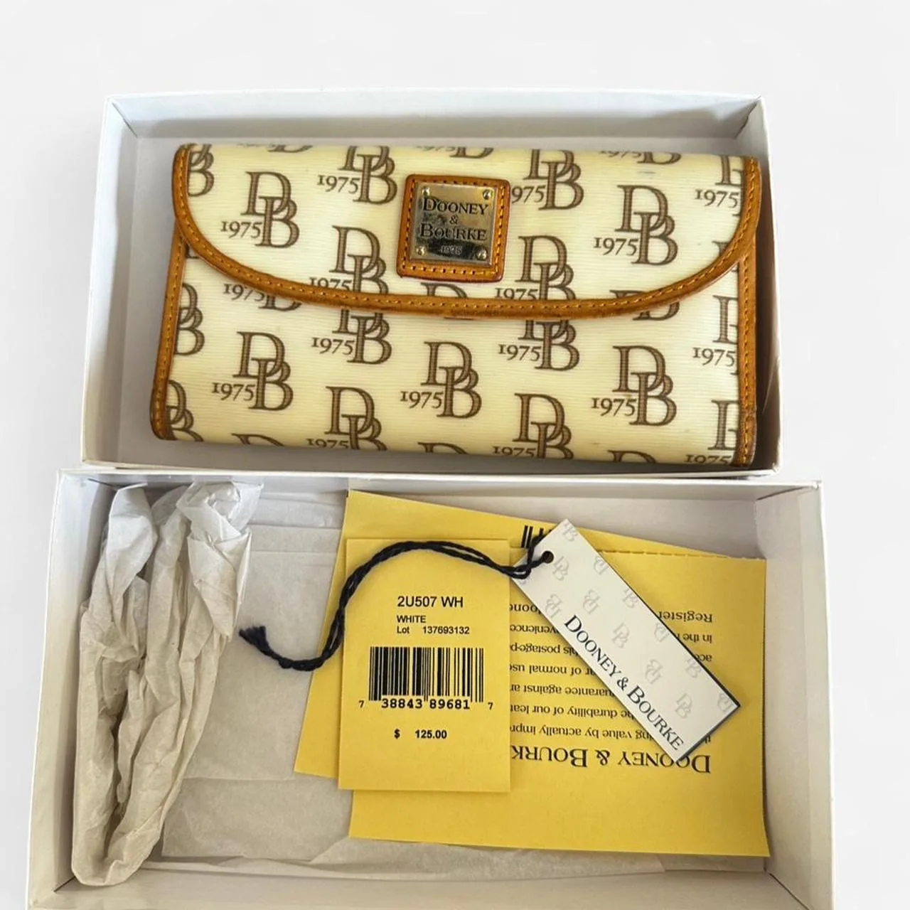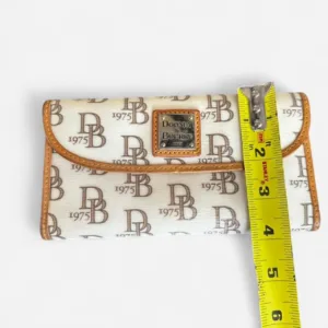 Dooney & Bourke white monogram leather wallet with tan and red accents.