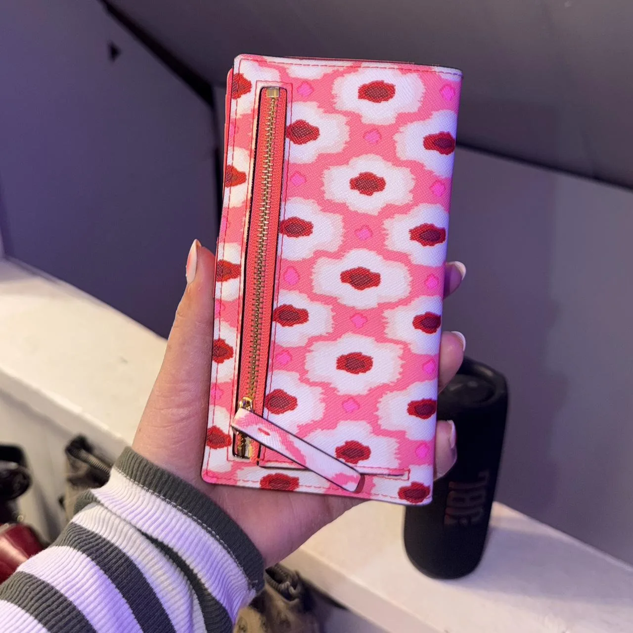 Kate Spade Laurel Way Stacy wallet in an abstract pink, white, and floral pattern.