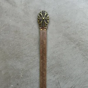 Brown and gold belt with flower design and a gold engraved buckle