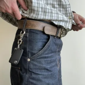 note: significant wear to one belt loop as pictured, and light wear to the keeper.