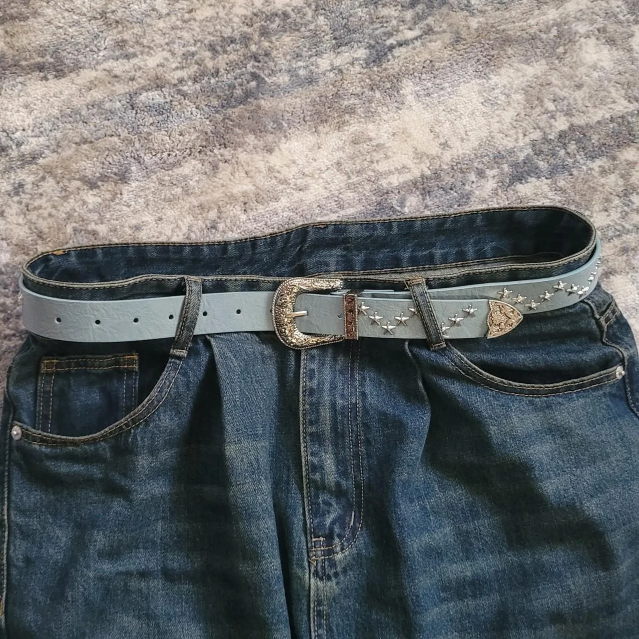 Light Blue Faux Leather Belt With Silver Stars and Buckle