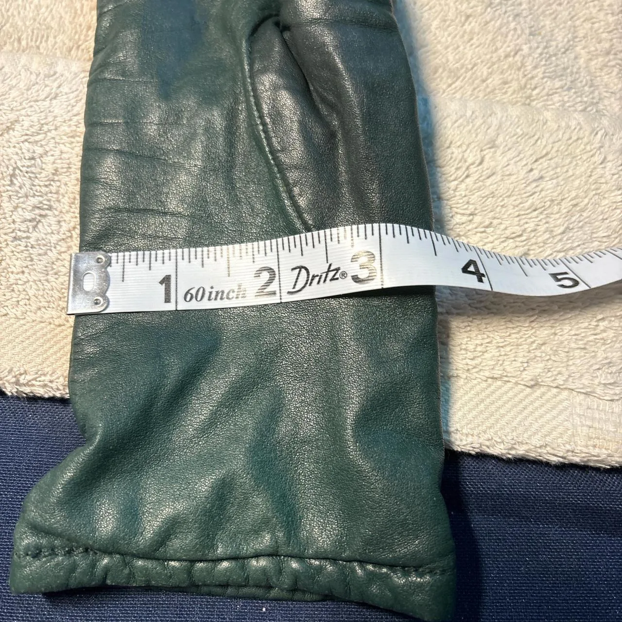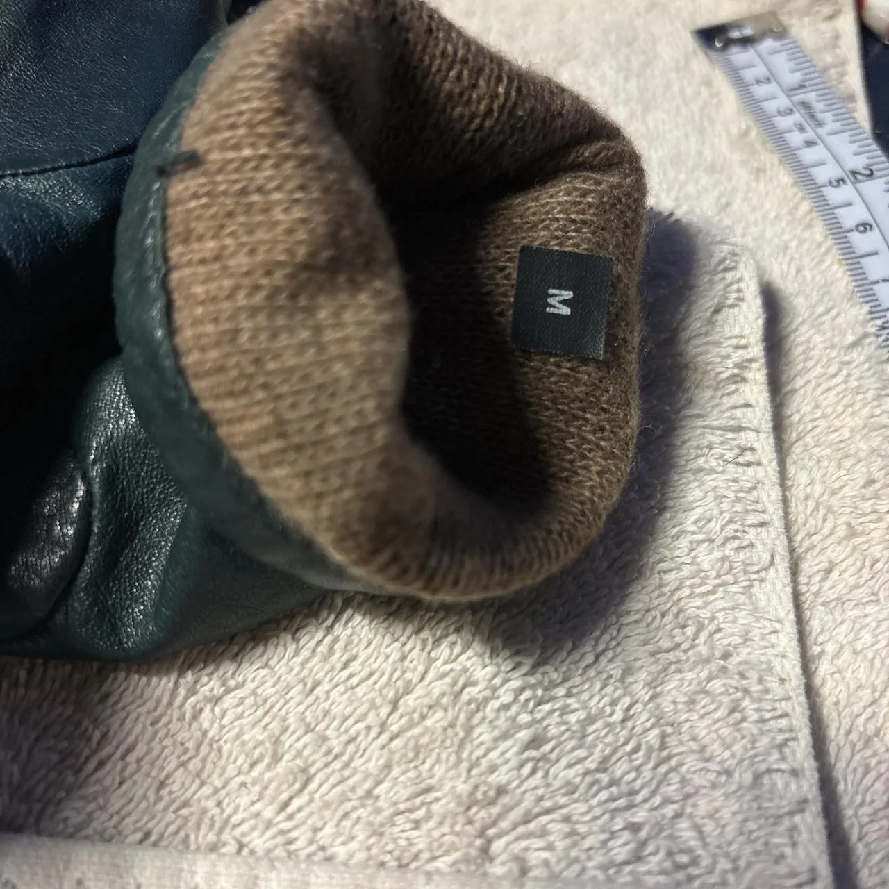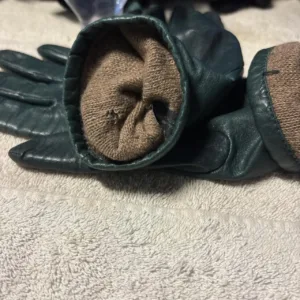 Green leather and cashmere gloves, 10″ long, holes in cashmere only in the right glove as seen in picture 5. 3 1/2 across the bottom of the thumb does stretch #leathergloves