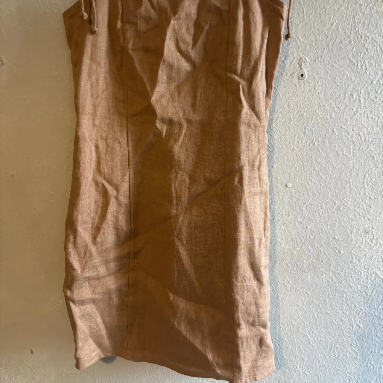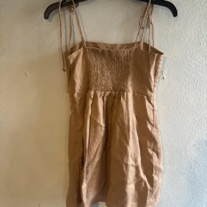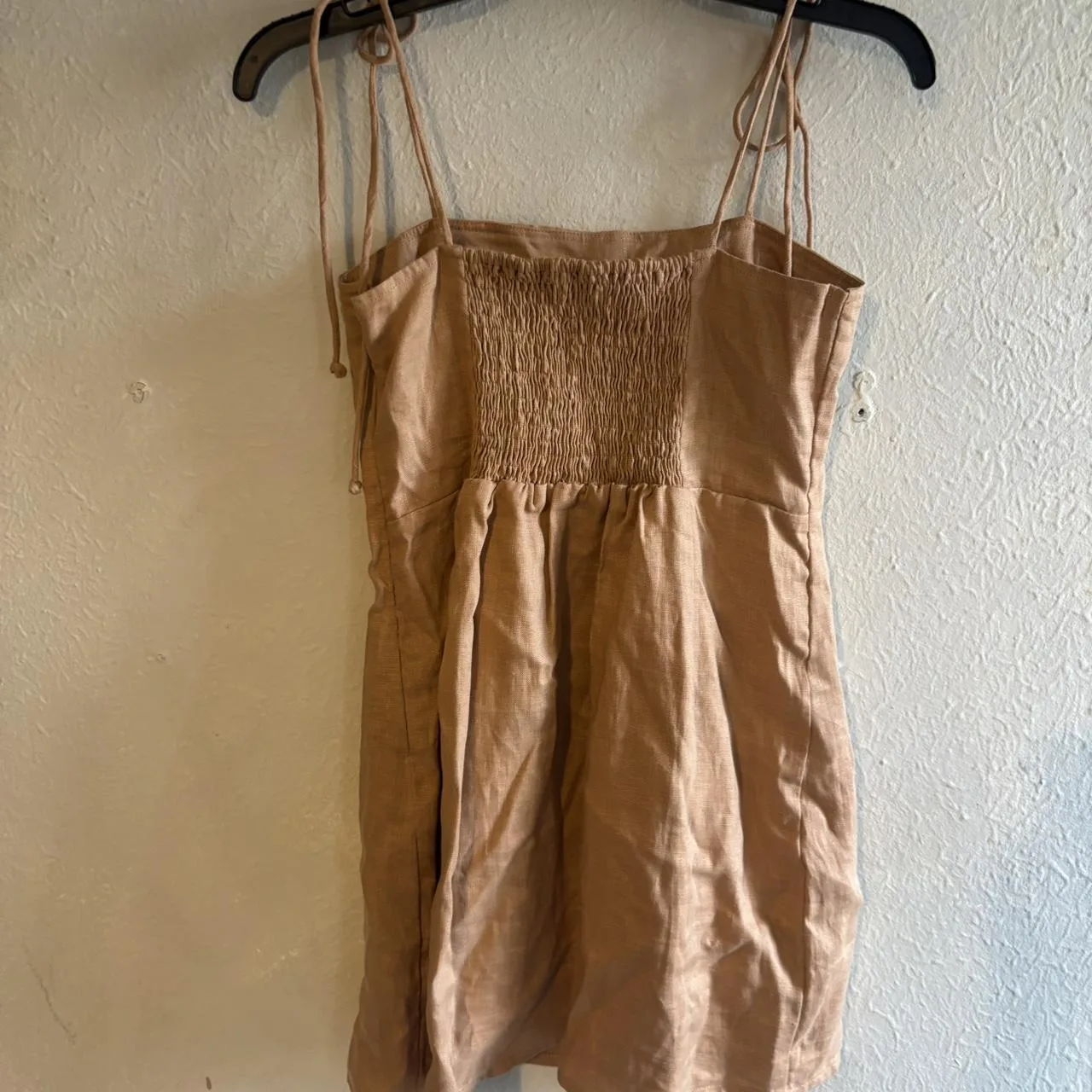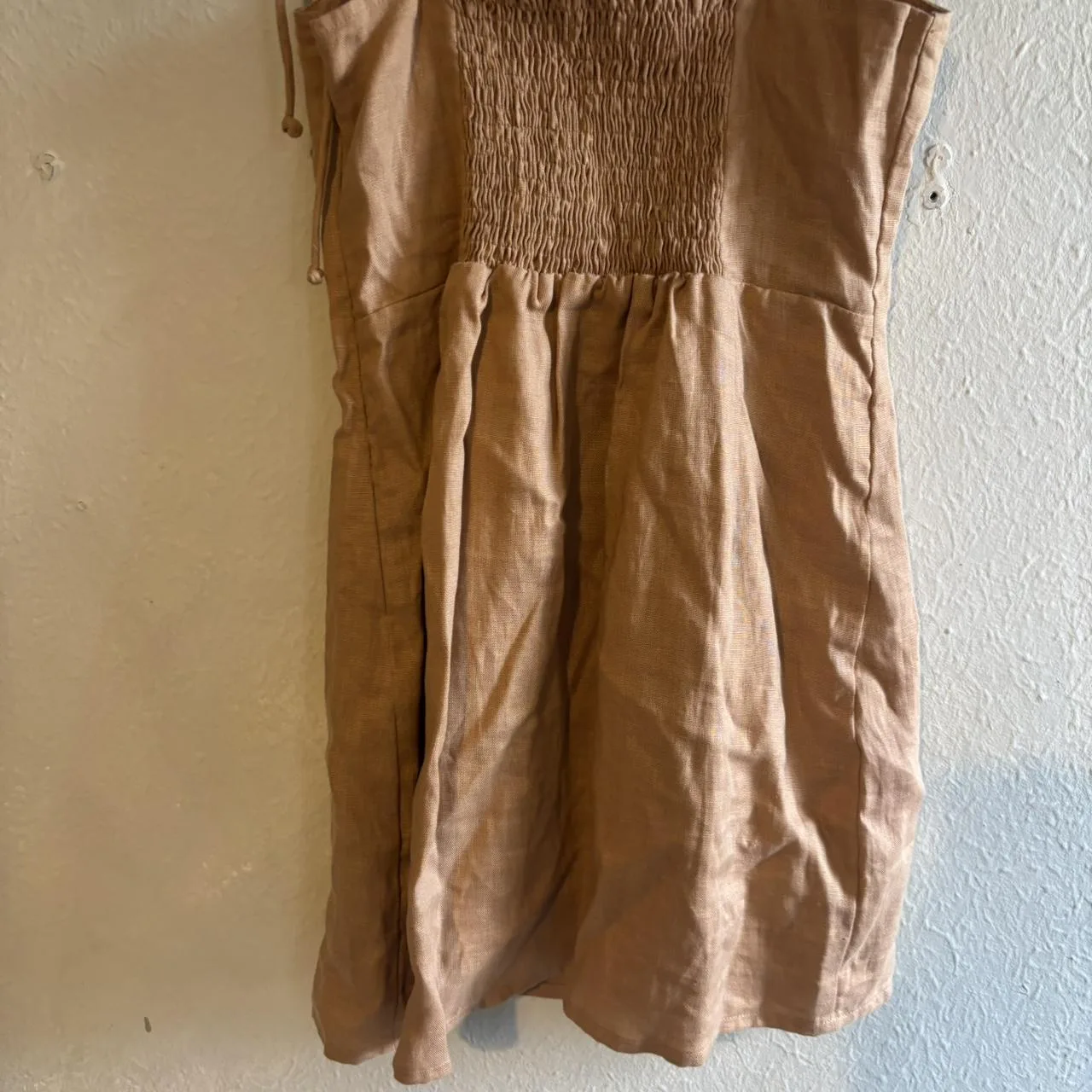Tan linen mini dress with adjustable straps. Size: 8 #linen #summerdress #beachwear