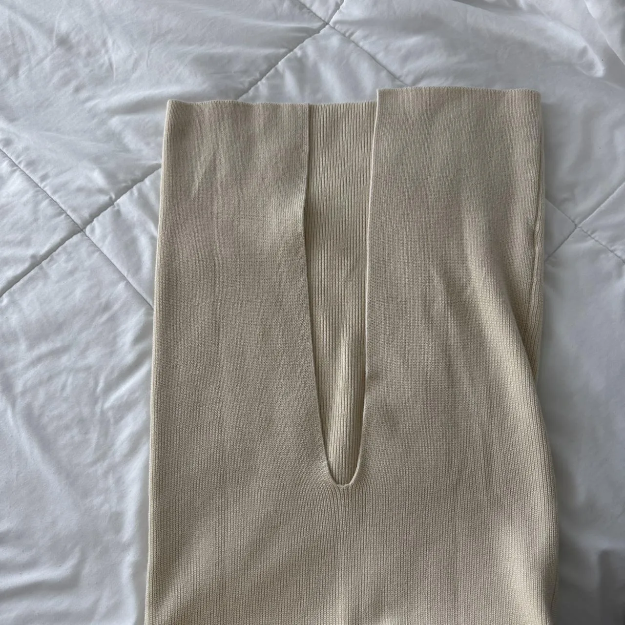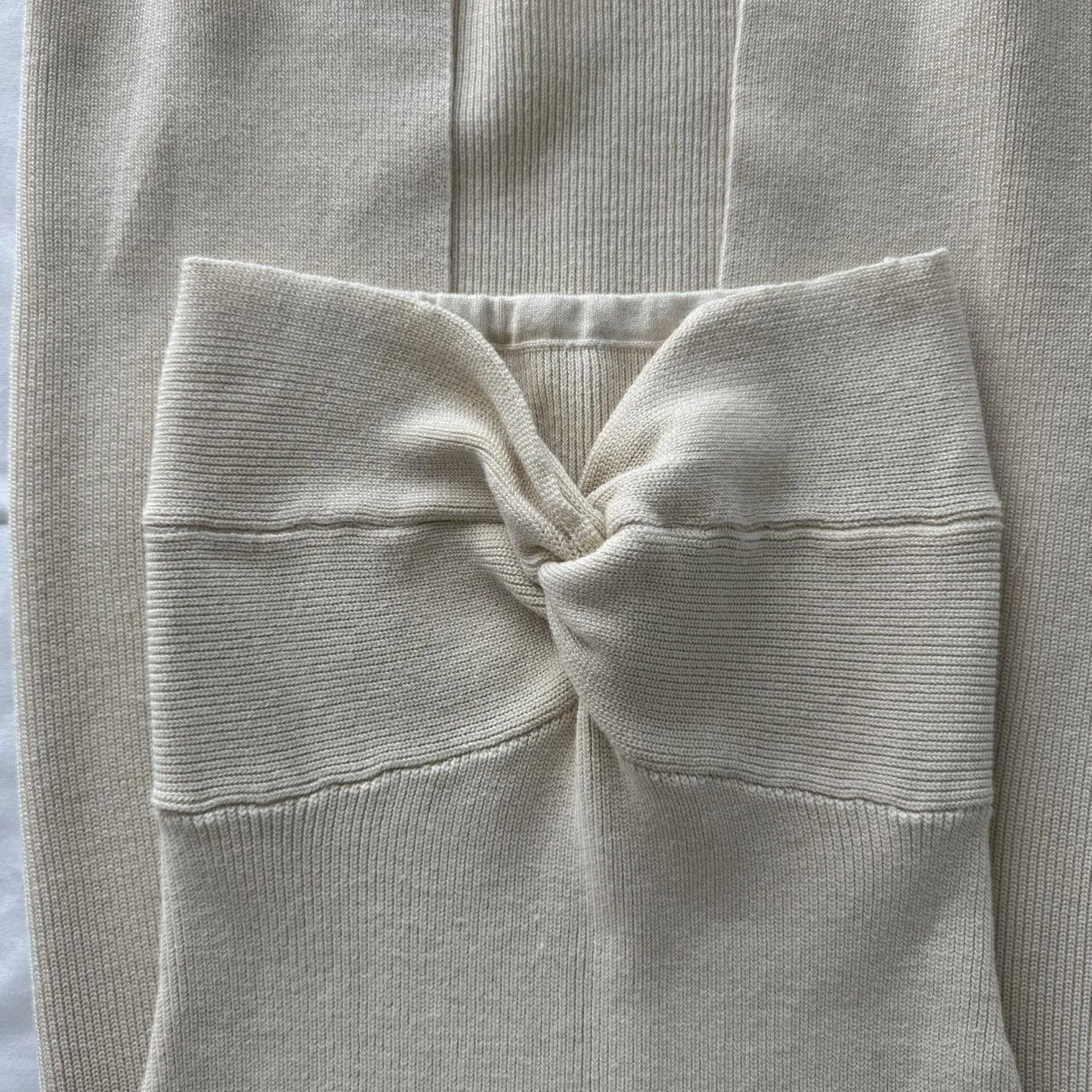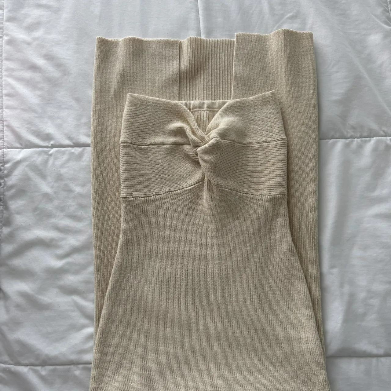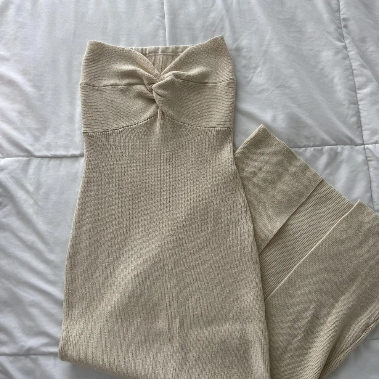 – beige twist strapless maxi bodycon dress