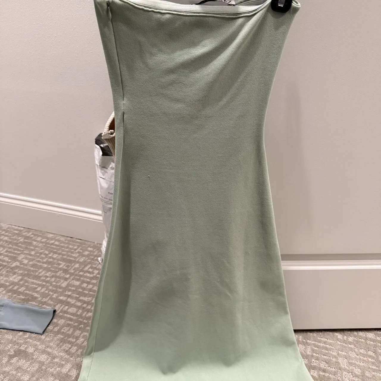 strapless, midi length, pastel green, bodycon, sleeveless, summer dress, elegant, stretch fabric, formal, minimalist