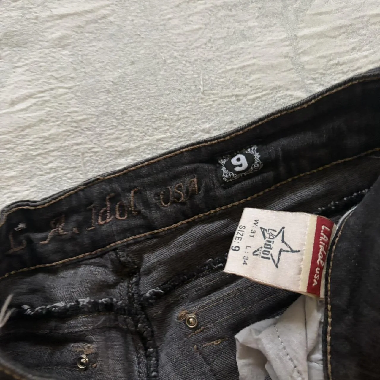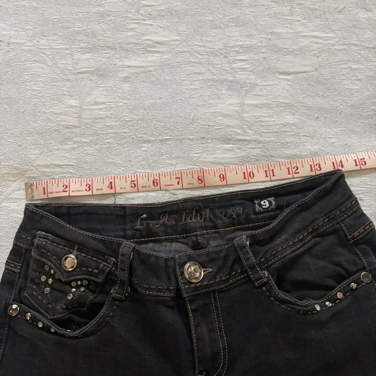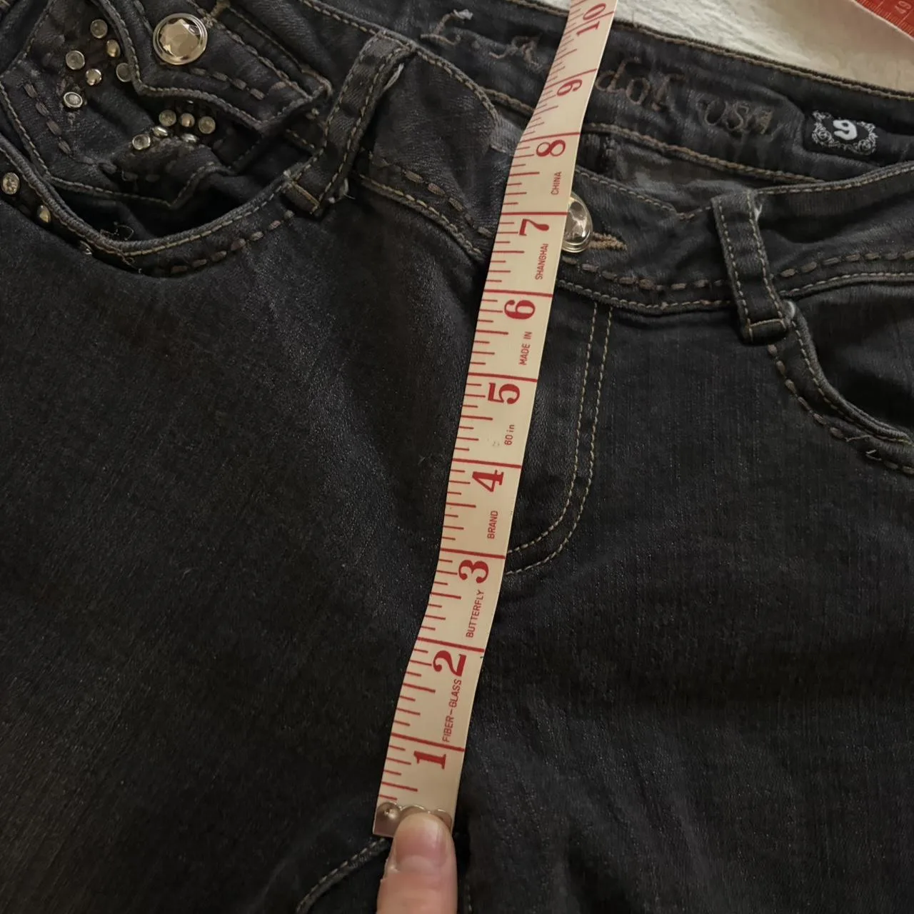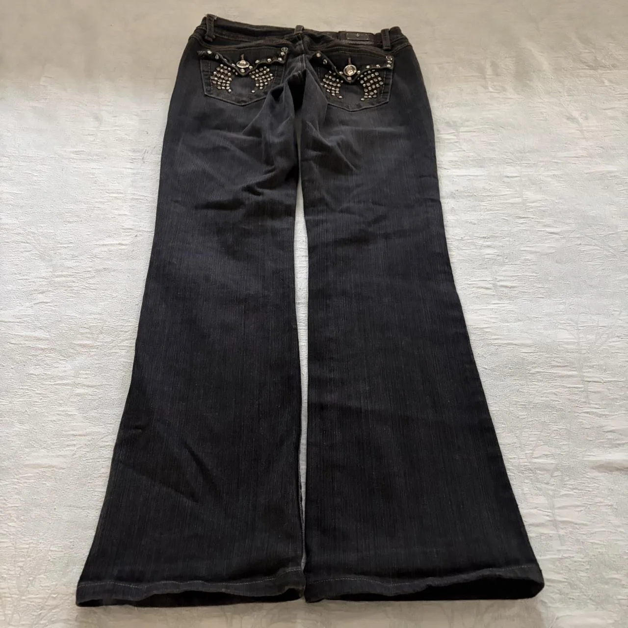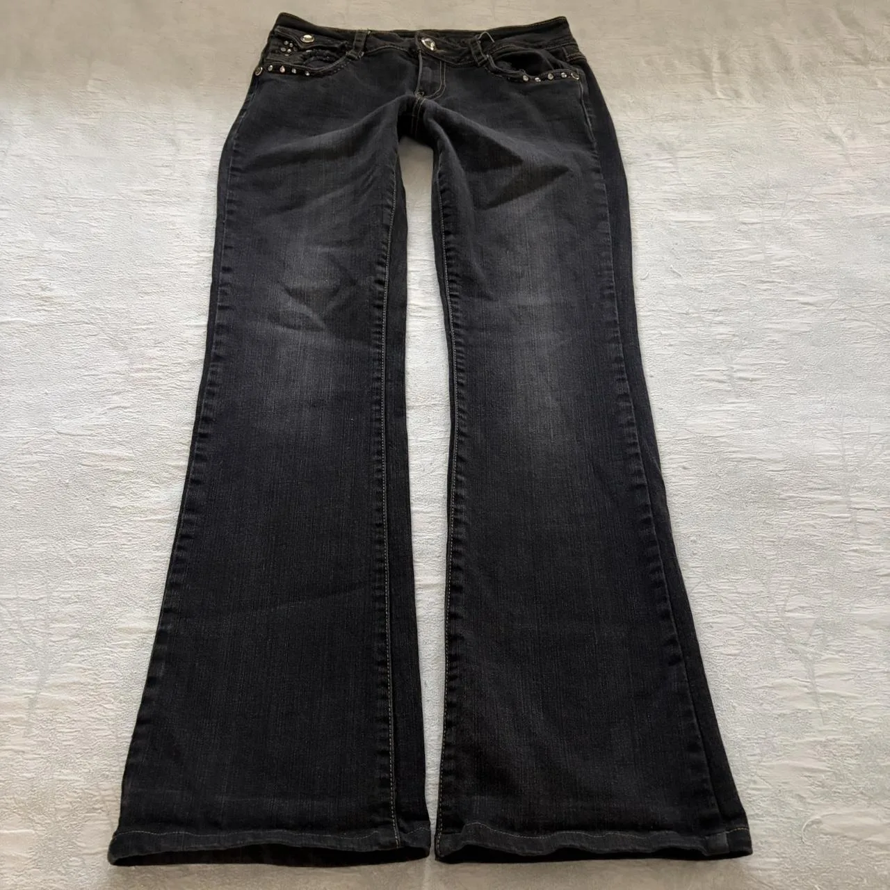 Y2K black bedazzled low rise bootcut jeans.