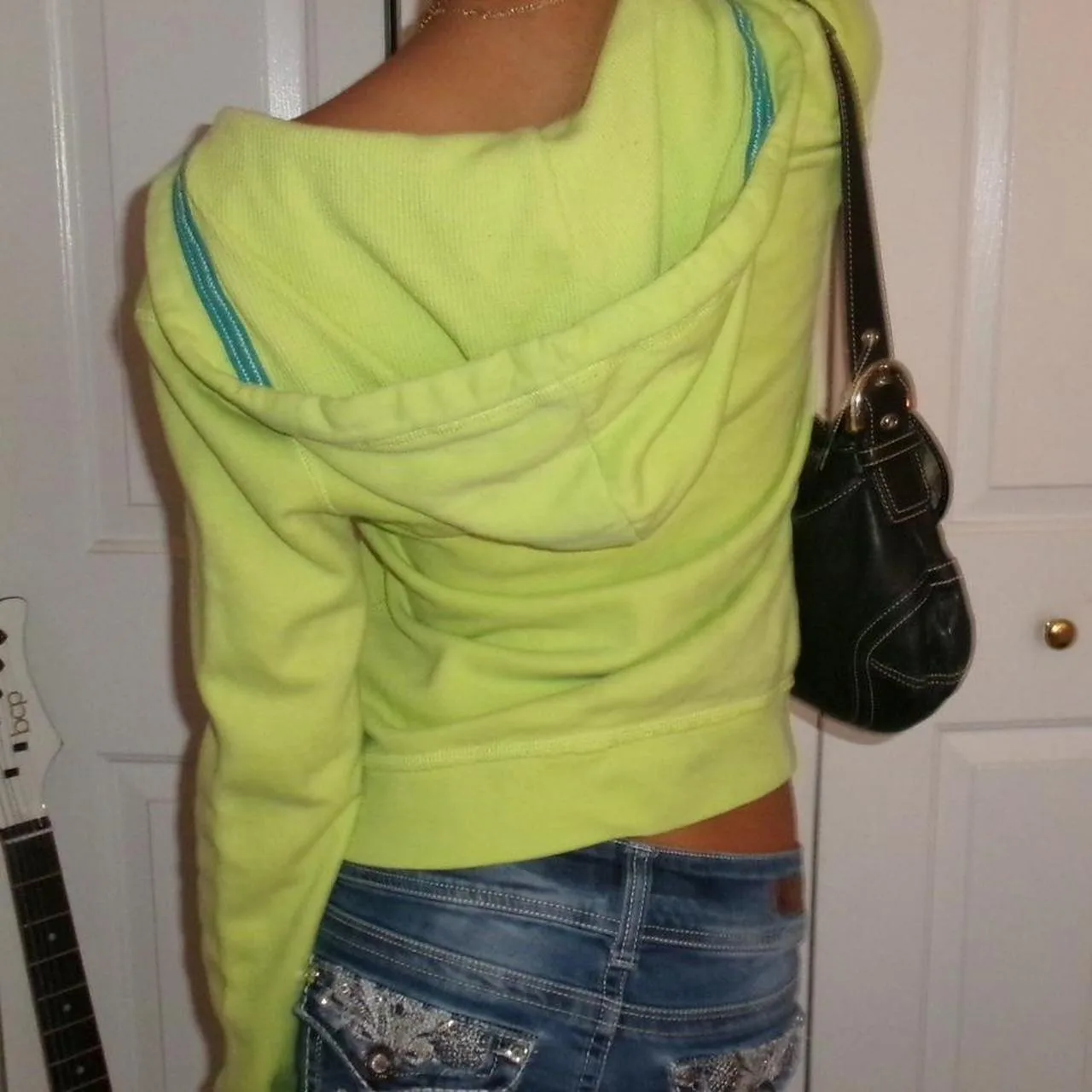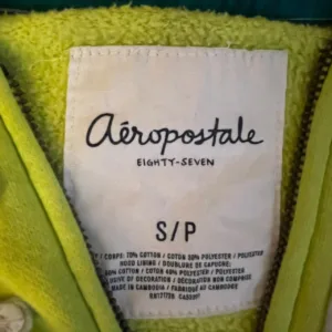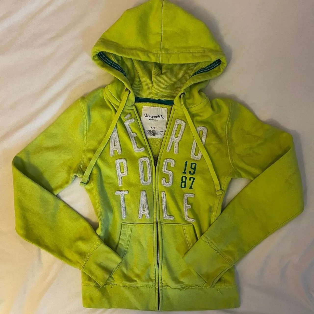 Neon green Aeropostale zip up. There’s a slight darker stain where the sleeve meets the torso, but I haven’t tried to get it out. Hy2k #preloved #vintage #2000s