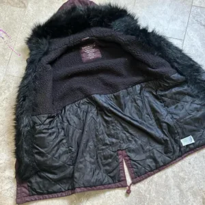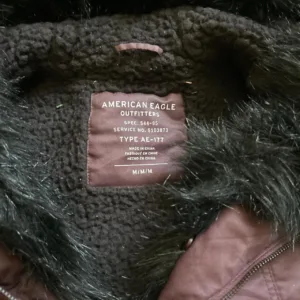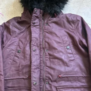 Excellent condition, button snap + zip up. Sherpa lined on the inside. The color is burgundy.