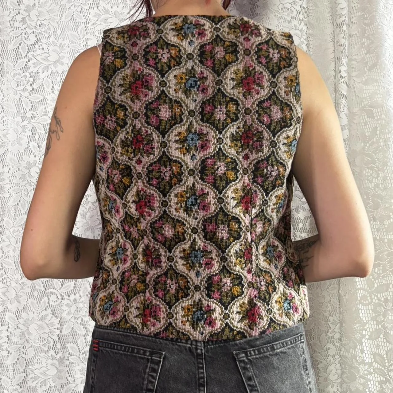 Vintage floral embroidered vest. Tag reads Artbro Jr.Sportswear, labeled a size 7 fits M/L. 2/3 of the “buttons” work the very first one is missing the “button” as pictured.